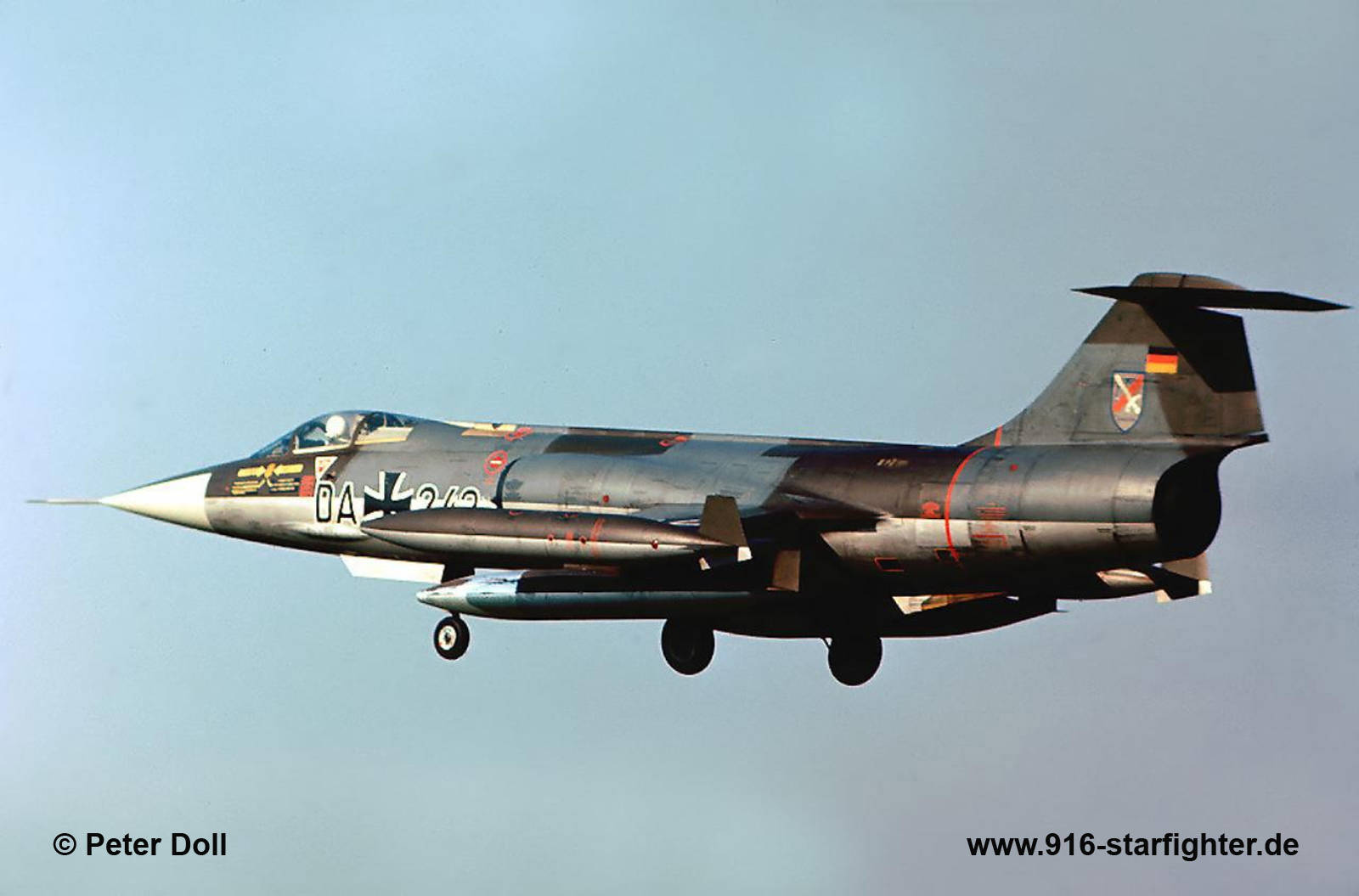 F-104G DA+243 JaboG 31 on final at Norvenich AB, 1966; note the M61 machine gun muzzle opening being faired over F-104G, construction number 683-2045, company model 683-10-19, built by Lockheed manufactured by Group USA (ARGE-USA); assembly in Fighterbomber version according contract lot 5 at Palmdale; for test flights coded "145" acceptance date December 14, 1961 by BABwLockheed; coded KF+121 for system tests at Palmdale with 115:55 flight hours flown in 1962 airlifted to Germany August 7, 1962 in a Canadair CL-44D airfreighter of "Flying Tiger Line"; project "Loreley" was not implemented project "Replace" with modification as Fighterbomber with the Vulcan M61 20 mm machine gun installed and long range tanks as loose parts test flight at Messerschmitt on November 6, 1962; acceptance date February 4, 1963 by BABwMTT DA+243 JaboG 31 "Boelcke" at Norvenich AB delivery date on February 26, 1963 in Silver-finish colors; at 4.Tactical Weapons Meet in Chaumont France seen June 11, 1965 July 1, 1965 heavily damaged after take-off abort due to nose wheel shimmy; by truck to Messerschmitt for repair camouflage scheme "Norm 62" according tech order "TA-196" in 1966, back to JaboG 31 on September 9, 1966 20+38 Tactical Weapons Meet at Twenthe AB May 1976; JaboG 34 at Memmingen AB on May 2, 1983; TechnGrp 11 at Erding AB on June 6, 1984 withdrawn from use at LwSchleuse 11 on March 6, 1985 with 3.870 flight hours; struck off charge order (AVA) December 18, 1984MAP (Military Assistance Program) to Turkish Air Force June 11, 1985 (with TuAF serial number 61-2045); coded "4-45" at 4.AJU at Murted AB; coded "9-045" with 193 Filo at Balikesir AB in 1988 withdrawn from use on October 24, 1989; preserved at Balikesir AB in old Luftwaffe color scheme in April 1994 first noted; March 2009 noted; April 2010 noted; scrapped. Project "Replace": 21 aircrafts (partly with and partly without test flights) were stored with a long-term preservation for the purpose of a later upgrade and were transferred to the BABwMTT for storage at Manching AB. 19 aircraft were later upgraded when enough retrofit kits were available. copyright © Peter Doll