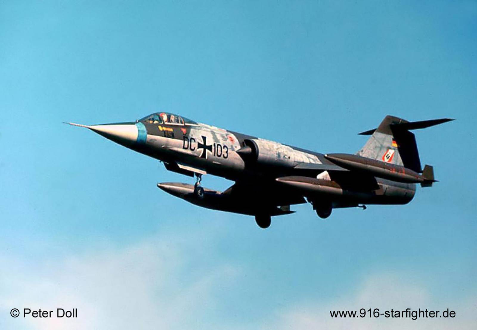 F-104G DC+103 JaboG 33 landing at RAF Wildenrath during Tactical Weapons Meet 1967 F-104G, construction number 683-2075, company model 683-10-19, built by Lockheed manufactured by Group USA (ARGE-USA); flight test release May 7, 1962; assembly in Fighterbomber version according contract lot 7 flown with register number "175" for test flights; acceptance date June 6, 1962 by BABwLockheed with 12:20 flight hours in Silver-finish colors coded KF+150 airlifted to Messerschmitt-Manching, Germany on June 21, 1962 in a Canadair CL-44D airfreighter of "Flying Tiger Line" project "Loreley" as Fighterbomber (for JaboG 33) with Vulcan M61 20 mm machine gun installed and long range tanks as loose parts; test flights by Messerschmitt on August 1, 1962 DC+103 delivery date August 22, 1962 to JaboG 33 at Buchel AB; to Messerschmitt on December 9, 1964 for upgrading camouflage scheme "Norm 62" according tech order "TA-196" in 1965, back to JaboG 33 on September 6, 1965; NATO exercise "Tactical Weapons Meet" 1967 at RAFG Wildenrath 16 till 30 June 1967 20+64 28. September till 7. October 1976 squadron exchange with Dutch Air Force 312 squadron, based at Volkel AB EL-70/EL-73 Electronic Counter Measure (ECM) system was installed in the weapon system in the late 70s with tech order "TA-FL1191" JaboG 34 at Memmingen AB on July 26, 1985; withdrawn from use and stored at LwSchleuse 11 on July 17, 1987 with 3.797 flight hours struck off charge order (AVA) January 13, 1989; front section modified by LVR 1 (TechnGrp 11) on June 22, 1992 to a simulator for DFL (Demo Flugsimulator Luftfahrtzeug) for display "Unsere Luftwaffe" of Luftwaffenamt Köln-Wahn in 1993, rest for BDRT training use and scrapped; cockpit noted on July 13, 1996 at Roth in a container; August 12, 2007 noted at the Köln-Wahn family day stored at "Wehrtechnische Studiensammlung" of BWB (Bundesamt für Wehrtechnik und Beschaffung) at Koblenz in 2007 on loan to "Aeronauticum" Nordholz in December 2012; December 22, 2012 first mentioned; as Flight demonstrator July 2024 noted. Project "Loreley": 42 Fighterbomber for the second wing designated to be converted being JaboG 33 (FBW 33) at Buchel AB. copyright © Peter Doll