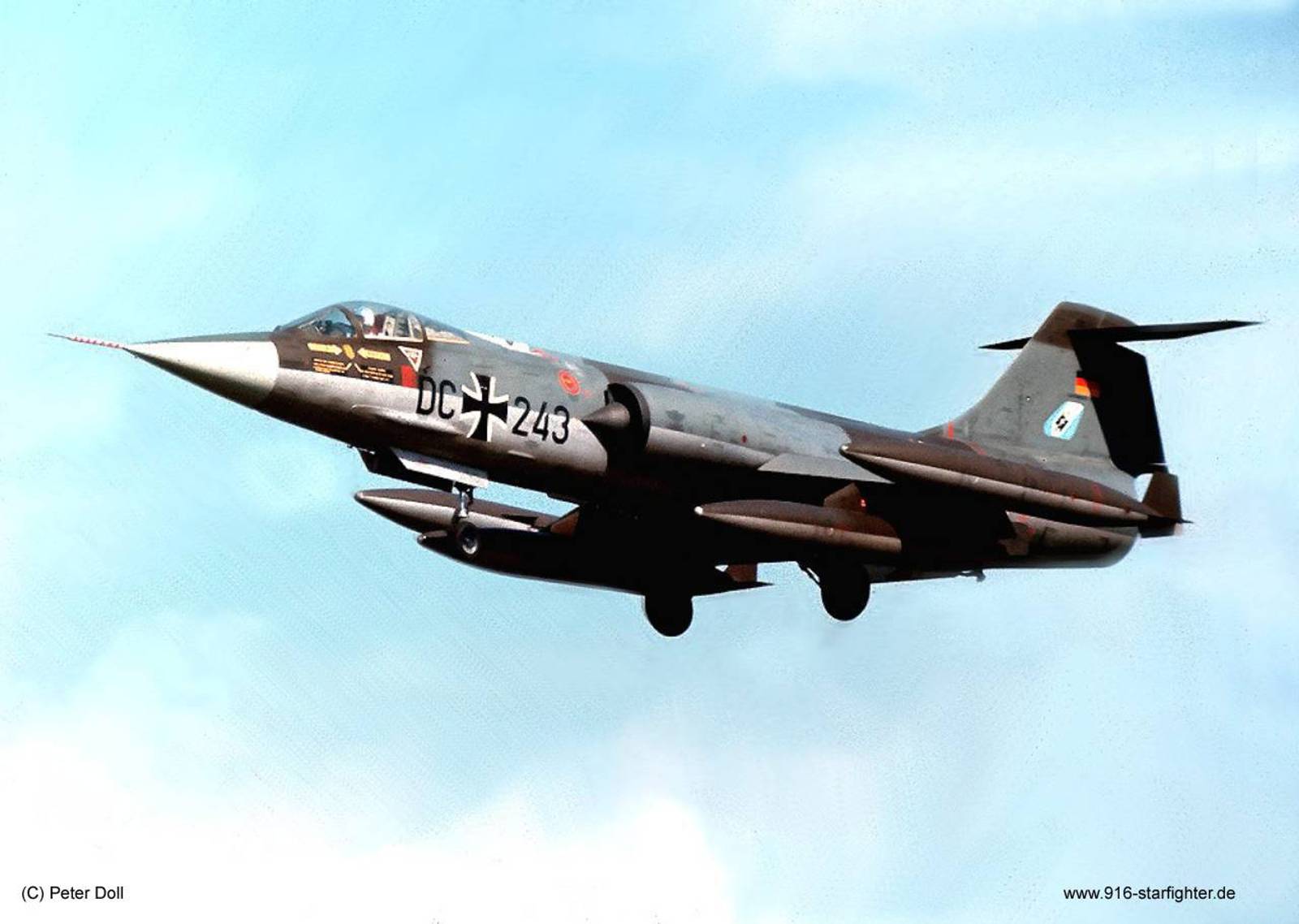 F-104G DC+243 JaboG 33 in 1965 F-104G, construction number 683D-7059, company model 683-10-19, built by Messerschmitt (MTT) manufactured by South Group (ARGE-Süd); assembly start by Messerschmitt-Manching October 16, 1962 assembly in Fighterbomber version according contract lot 2; first flight April 4, 1963 coded KE+359 project "Loreley" as Fighterbomber (for JaboG 33) with Vulcan M61 20 mm machine gun installed and long range tanks as loose parts acceptance date by BABwMTT May 30, 1963 with 7:05 flight hours DC+243 JaboG 33 at Buchel AB delivery date on May 31, 1963 in Silver-finish colors; camouflage scheme "Norm 62" according tech order "TA-196" in December 1965 21+90 IRAN at SABCA January 6, 1969 with 954 flight hours; to JaboG 31 at Norvenich AB on August 1, 1969 JaboG 33 at Buchel on August 11, 1970; JaboG 32 at Lechfeld AB on March 10, 1981; TechnGrp 11 at Erding AB on January 19, 1983 JaboG 32 at Lechfeld AB on May 31, 1983; TechnGrp 11 on April 11, 1984 withdrawn from use at LwSchleuse 11 on September 6, 1984 with 3.518 flight hours; struck off charge order (AVA) October 2, 1984MAP (Military Assistance Program) to Turkish Air Force (TuAF serial number 63-7059) on November 6, 1984; initially to 4.AJU coded "9-059" in May 1988 with 192 Filo of 9.AJU at Balikesir AB; March 1992 with 193 Filo noted; January 21, 1993 to 191 Filo withdrawn from use and stored on April 28, 1993; CFE cut-up July 18, 1995; scrapped. Project "Loreley": 42 Fighterbomber for the second wing designated to be converted being JaboG 33 (FBW 33) at Buchel AB. copyright © Peter Doll