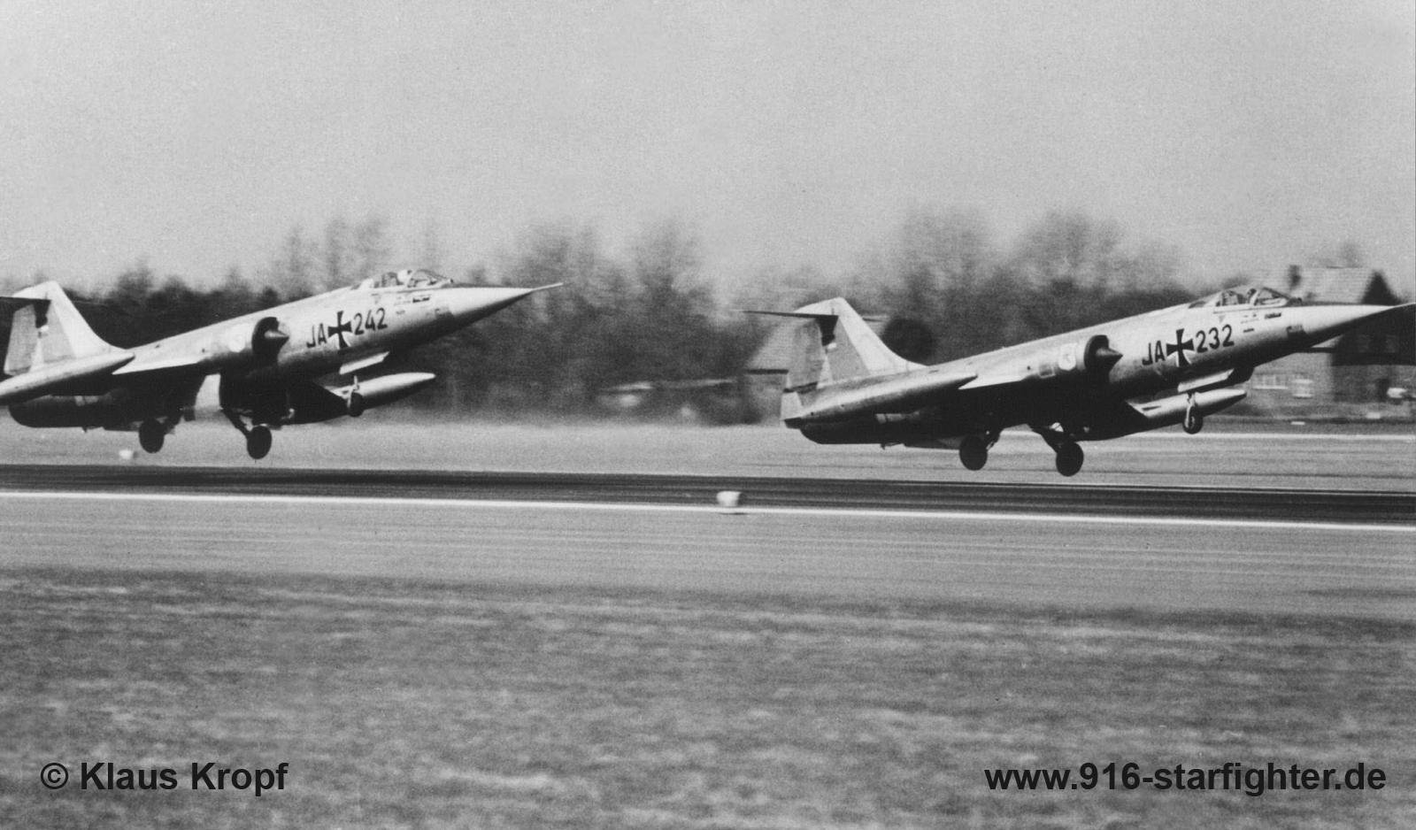 F-104G JA+232 JG 71 leading the formation take-off F-104G, construction number 683D-8036, company model 683-10-19, built by Fokker manufactured by North Group (ARGE-Nord); first flight November 17, 1962 coded KG+136 at Fokker-Schiphol AWX (All Weather Fighter) version under project "Green Hill" (for JG 71); acceptance date July 22, 1963 by BABwFokker with 6:55 flight hours JA+232 JG 71 "Richthofen" at Wittmund AB delivery date on July 30, 1963 in Silver-finish colors crashed May 11, 1964 at Wittmund AB during landing in rain and bad visibility; aircraft hit the approach lights and was destroyed the pilot was killed; written off; struck off charge order (AVA) February 24, 1965. Project "Green Hill": 42 AWX airplanes were delivered to the Fighter Wing 71 (Jagdgeschwader 71) at Wittmund. copyright © Klaus Kropf