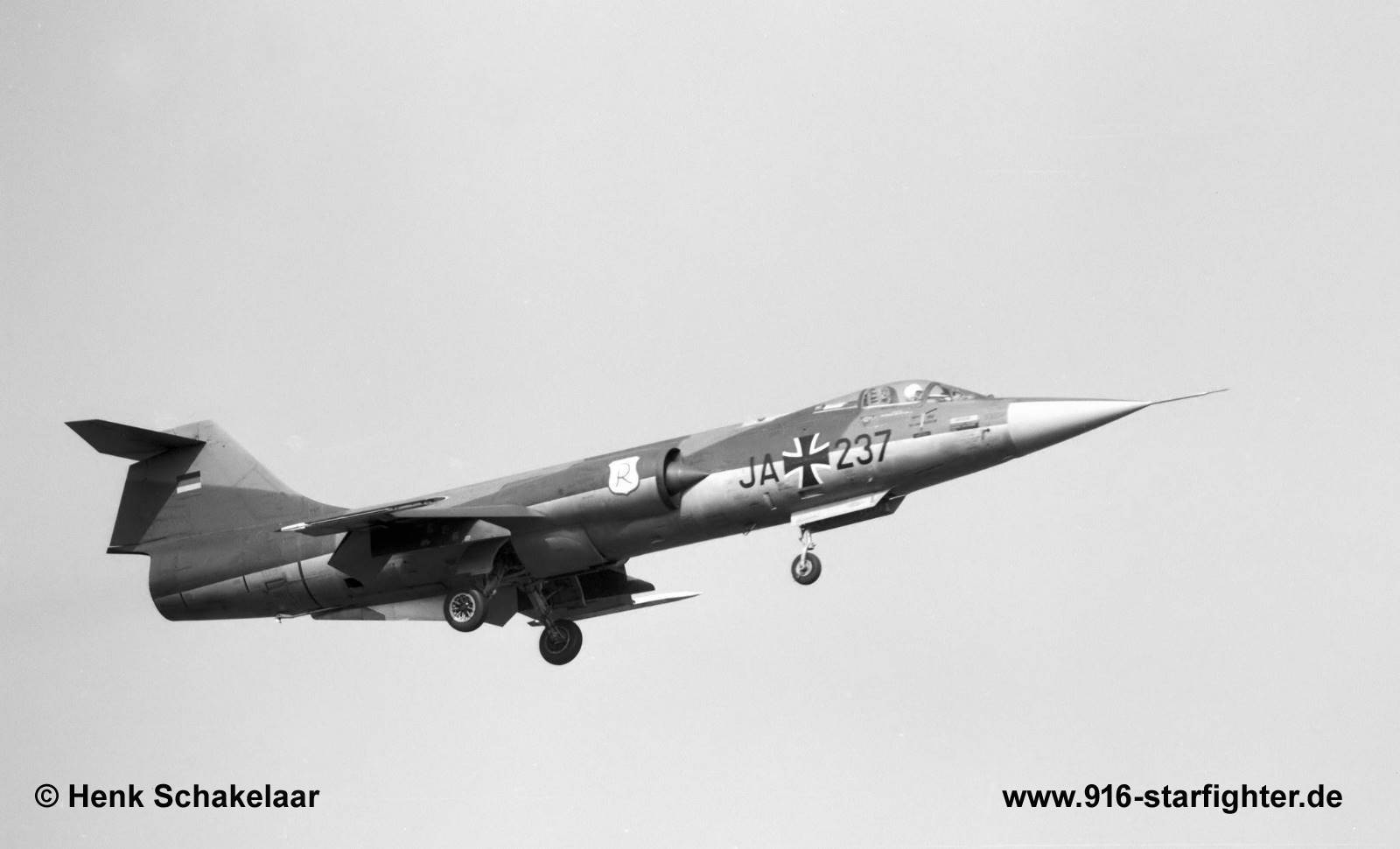 F-104G JA+237 Jagdgeschwader 71 (JG 71) landing at Wittmund AB in April 1967 F-104G, construction number 683D-8054, company model 683-10-19, built by Fokker manufactured by North Group (ARGE-Nord); first flight February 25, 1963 at Fokker-Schiphol coded KG+154 in AWX (All Weather Fighter) version under project "Green Hill" (for JG 71) D-8054 for a press photo session by Fokker company on July 17, 1963, only that day the F-104G was carrying the serial "D-8054" (It was not (never) planned to go to the Dutch Air Force!) acceptance date June12, 1963 by BABwFokker in Silver-finish colors with 5:00 flight hours JA+237 to JG 71 "Richthofen" at Wittmund AB delivery date July 17, 1963 camouflage scheme "Norm 62" according tech order "TA-196" in 1964 23+64 IRAN at SABCA on June 19, 1968 with 601 flight hours, back to JG 71 on September 27, 1968 withdrawn from use at LVR 1 on April 10, 1974 with 1.549 flight hours; struck off charge order (AVA) December 4, 1973 to ErpSt 53 Munster on August 17, 1974 for fire fighting trials; in October 1985 scrapped. Project "Green Hill": 42 AWX (All Weather Fighter) aircraft were delivered to the Fighter Wing 71 (Jagdgeschwader 71) at Wittmund. copyright © Henk Schakelaar