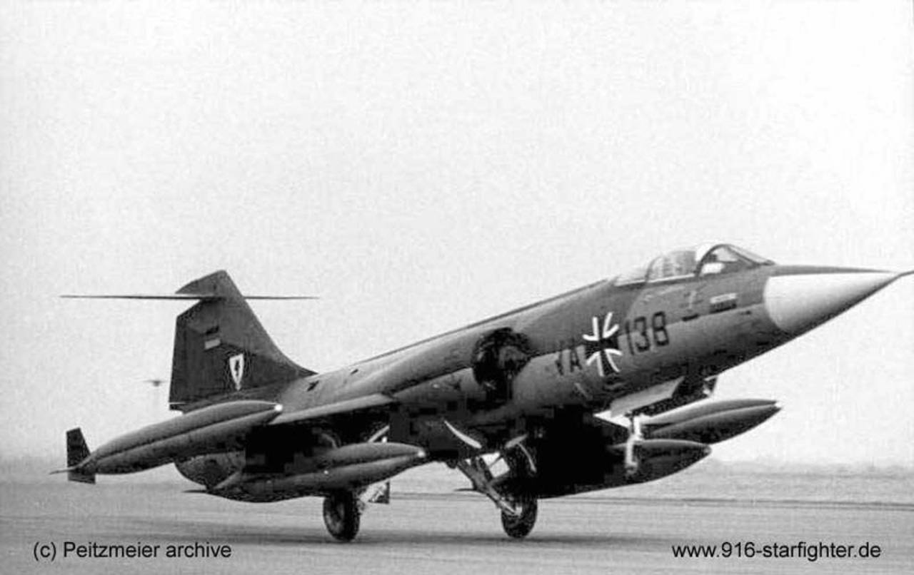 F-104G VA+138 MFG 1 in 1967 F-104G, construction number 683D-7162, company model 683-10-19, built by Messerschmitt (MTT) manufactured by South Group (ARGE-Süd); assembly start at Messerschmitt-Manching March 23, 1964 assembly in Fighterbomber version according contract lot 6; first flight June 4, 1964 coded KE+462 project "Yoga" as Fighterbomber (for MFG 1) with AS.30 anti-ship missile delivery system, Sidewinder missile launch rails and long range tanks camouflage scheme "Norm 62" according tech order "TA-196"; acceptance date by BABwMTT August 28, 1964 VA+138 MFG 1 at Schleswig-Jagel AB delivery date on September 3, 1964 22+80 Navy camouflage scheme "Norm 76" according tech order "TA-196-3" in 1970 withdrawn from use at LwSchleuse 11 on March 25, 1981 with 2.268 flight hours; struck off charge order (AVA) June 4, 1981MAP (Military Assistance Program) to Turkish Air Force (TuAF serial number 64-7162 ) July 21, 1981 coded "4-162" with Sahin Kita conversion unit; in 1982 coded "6-162" with 6.AJU at Bandirma AB withdrawn from use and stored a Eskisehir AB March 22, 1989; CFE cut-up date unknown; scrapped. Project "Yoga": 22 F-104G Fighterbomber for the 2. Staffel (Squadron) of MFG 1 at Schleswig-Jagel with built-in "AS.30" anti-ship missile delivery wiring system, later the number was increased to 28. copyright © Peitzmeier archive