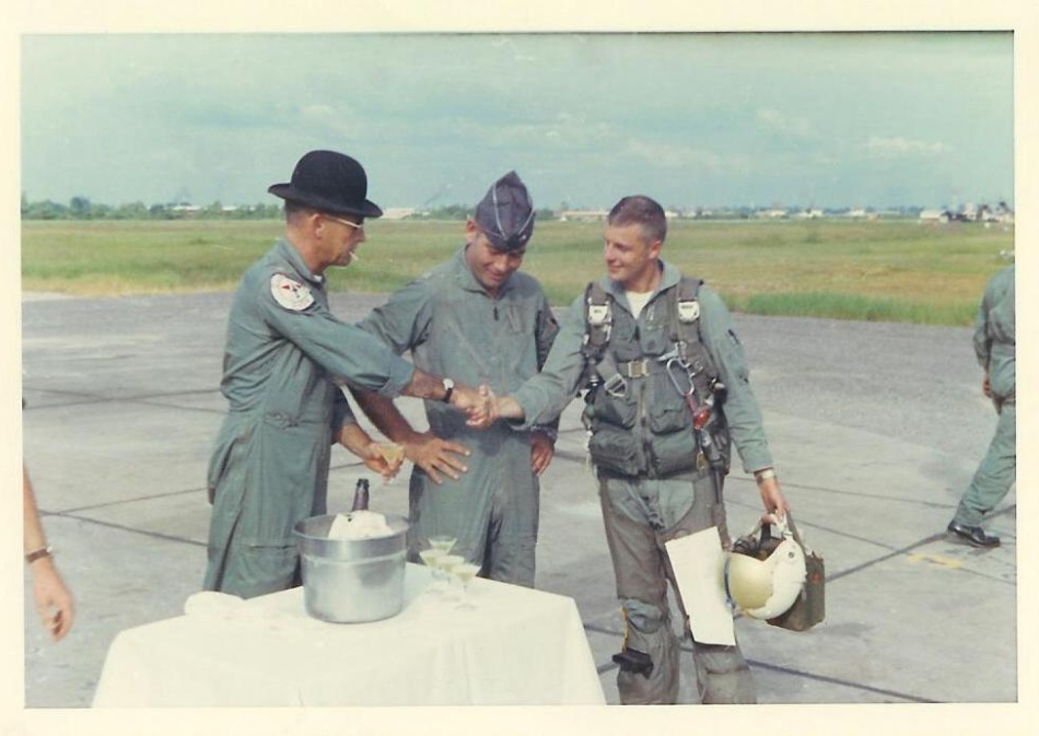 LtCol Ed Gaines, Squadron Commander (left) and Capt Mike Korte (center), who flew the squadron 1000 mission the same day, congratulating Capt