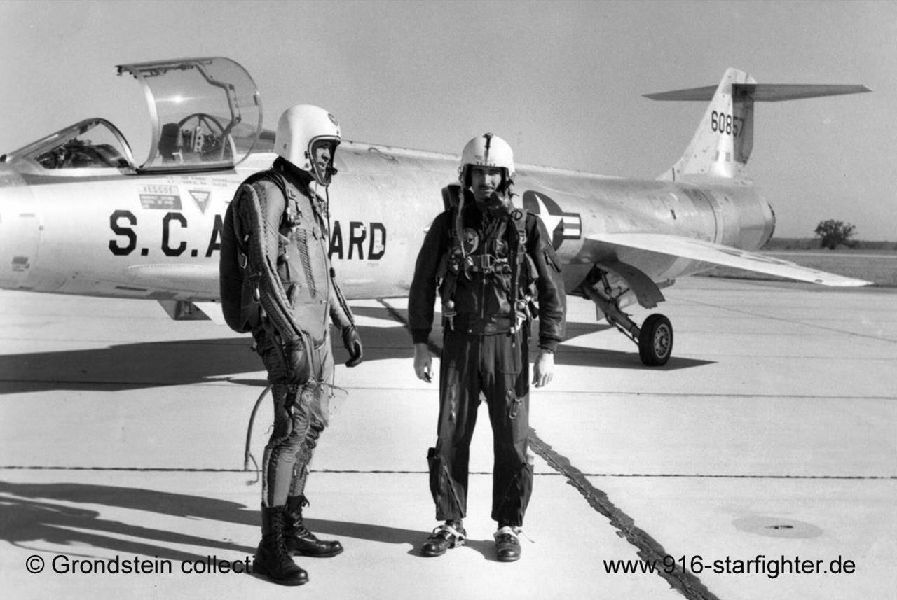 South Carolina Air National Guard F-104A "60857", one pilot wearing the high altitude full pressure suit 1960 157th Fighter Interceptor Squadron (FIS) South Carolina ANG; 169th FG, 140th ANG Wing Eastover AFB-McEntire ANGB, Eastover (Near Columbia), SC (Congaree AB prior to November 10, 1961) February 1960-June 1963 F-104A and F-104B trainer; a day interceptor unit motif: "Semper Primus", displaying a swamp fox riding on a bomb called to active duty as "Federalized" ANG squadron from November 1, 1961 until August 15, 1962 and relocated to Moron AB, Spain on November 24, 1961 under command of 65th Air Division USAFE; returned to state control at McEntire August 15, 1962 converted to F-102A/B Delta Dagger. copyright © USAF DoD via Grondstein collection