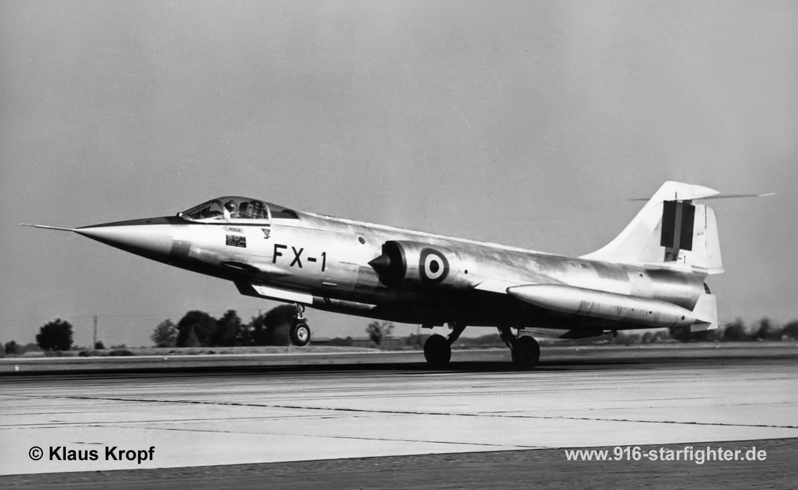 "FX-1" the first Belgian Air Force Starfighter at SABCA in December 1961, construction number 9001 (later to Germany) F-104G, construction number 9001, US serial number 63-13274, built by Lockheed, reassembled by SABCA the first F-104G serial 9001 was build and tested by Lockheed-Palmdale (USA); first flight August 3, 1961 at Lockheed, 30 flights total sold by Lockheed as pattern aircraft; the aircraft was then dismantled and ferried to Belgium where it was reassembled by the SABCA/Fairey consortium starting November 4, 1961 coded KH+101 at Gosselies, Belgium on November 4, 1961; project "42" as Fighterbomber (for JaboG 31) with Vulcan M61 20 mm machine gun installed and long range tanks as loose parts reassembly November 4, 1961; accepted by BABwSABCA in USAF Silver-finish colors; December 1, 1961 first flight by Bernard Neefs coded as "FX-1" at SABCA on December 4, 1961 representing the first European F-104G, construction number 9001 DA+105 JaboG 31 at Norvenich AB delivery date on May 16, 1962; recoded DR+105 on February 22, 1963 LPR 1 (Luftwaffenparkregiment 1) at Erding AB for system standardization according project "Balance" according project "Columbus" airlifted to Lockheed-Burbank, CA, coded BG+145 on July 22, 1963 operated by the 4510 CCTW at Luke AFB (shadow serial number 2556) in US Silver-finish colors coded 13274 crashed August 5, 1968 near Luke AFB in the landing pattern after a transition (first solo) mission, pilot ejected safely after encountering asymmetrical flap (Split Flaps) condition; pilot could not stop the roll tendency of the aircraft and ejected safely; operated by 4512 CCTS; 871 flight hours; struck off charge order AVA) December 11, 1968, written off. copyright © Klaus Kropf