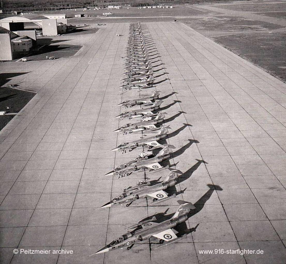 CF-104 "745" RCAF 6 ST/R OTU at Cold Lake, Canada in 1962 CF-104, Canadair model CL-90, Lockheed model 683A-04-12, Canadair construction number 683A-1045 RCAF serial number 12745, built by Canadair first flight February 23, 1962; after 11 flights with 15:55 flight hours delivered on April 26, 1962 crashed October 12, 1966 with 6 ST/R Operational Training Unit (OUT) 50 nautical miles north-east of Cold Lake after a bird strike caused an engine failure, pilot F/L R.R. Challoner ejected safely, written off. RCAF Canadian flag before February 15, 1965 copyright © Peitzmeier archive