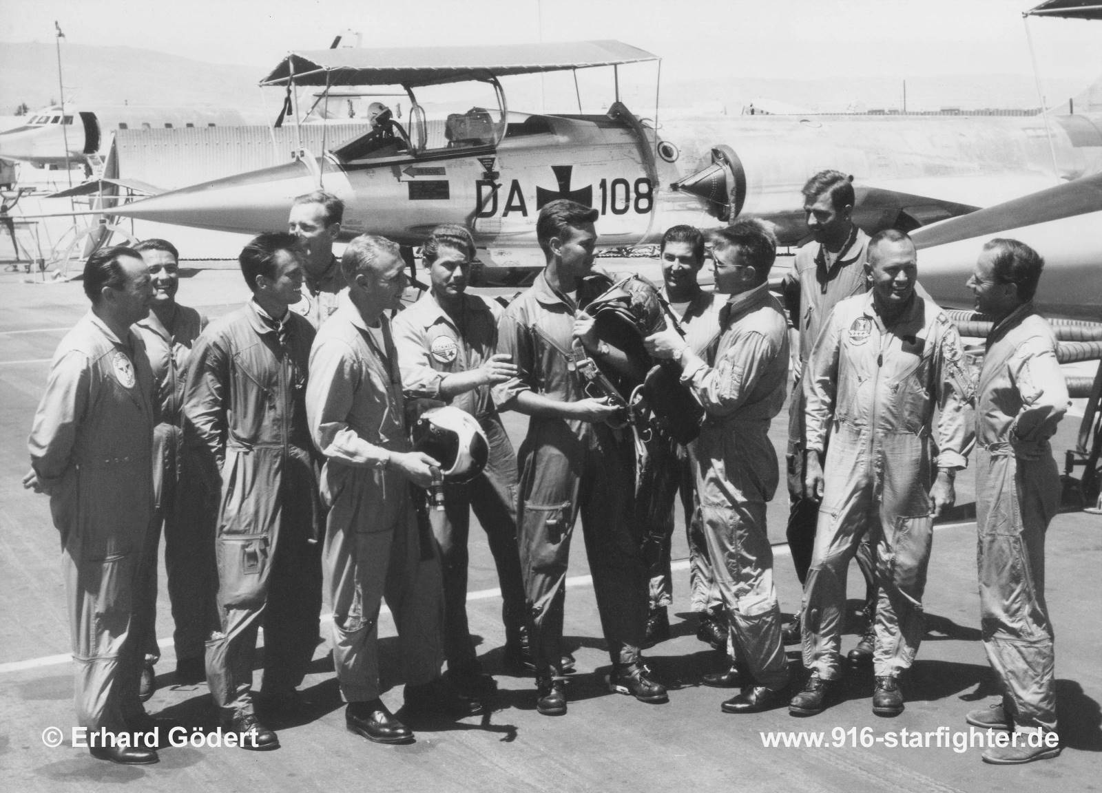 Summer 1960: instructor training by Lockheed at Palmdale for JaboG 31 Left to right: Major Heinz Birkenbeil (Joint Test Force), Maj Klaus Neumann, Olt Siegfried Heltzel, Bob Gilliland (IP), Bill Weaver (IP), Dieter Hermes (BwB), Olt Eckhard Schilling, Jim Jester (IP), Olt Erhard Gödert (Joint Test Force), Olt Peter Müller, Maj Walter W. Irwin (IP), Oberst Günther Rall (Systembeauftragter F-104 FüL). copyright © Erhard "Eddi" Gödert