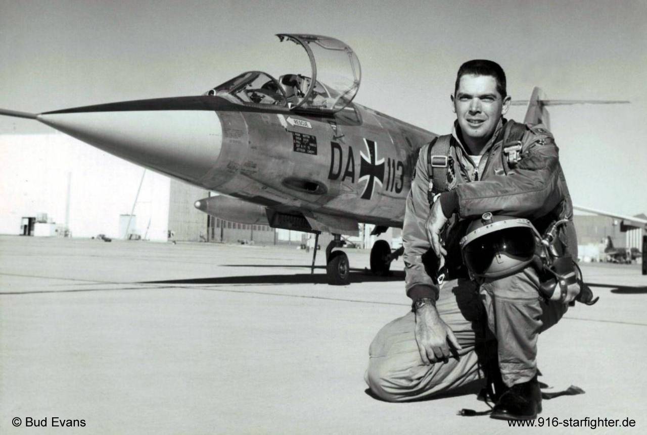 F-104G DA+113 Joint Test Force (JTF) "Category II" flight evaluation with Maj Evans 1962 Maj Evans with F-104G on Lockheed Plant Ramp, Palmdale, California He made the last downward ejection from an F-104. The aircraft got a Lockheed C-2 upward ejection seat, an oil pressure warning light, and a “butt kicker” system that throws an ejecting pilot out of the seat after the C-2 clears the aircraft. the "Order of Starfighters" of Norvin "Bud" Evans (USAF) is Number 31 copyright © Bud Evans