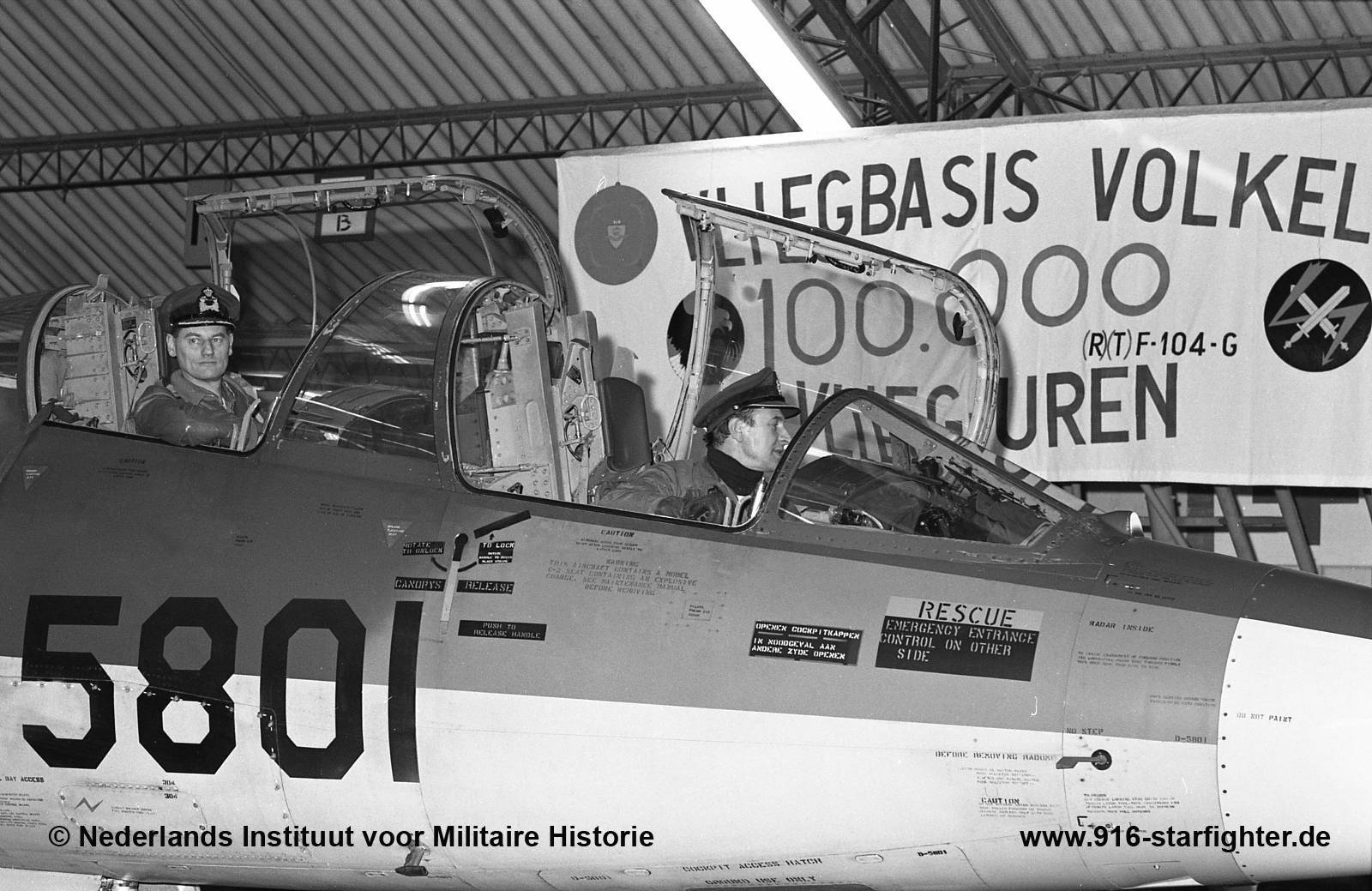 Koninklijke Luchtmacht 100.000 hours F-104 at Volkel AB 1975 With a fly-past of 16 Starfighters from Volkel, which passed over the home base in a tight formation, Volkel Air Base announced on January 17, 1975, that it had completed the 100,000th hour on this type of jet fighter. This in a period of 10 years. In the cockpit of a two-seat version of the Starfighter, the Chief of Flight Operations, Lieutenant Colonel-Flyer Borgsteyn is seated in the front and in the back the air base commander, Colonel-Flyer C. Baas. copyright © NIMH