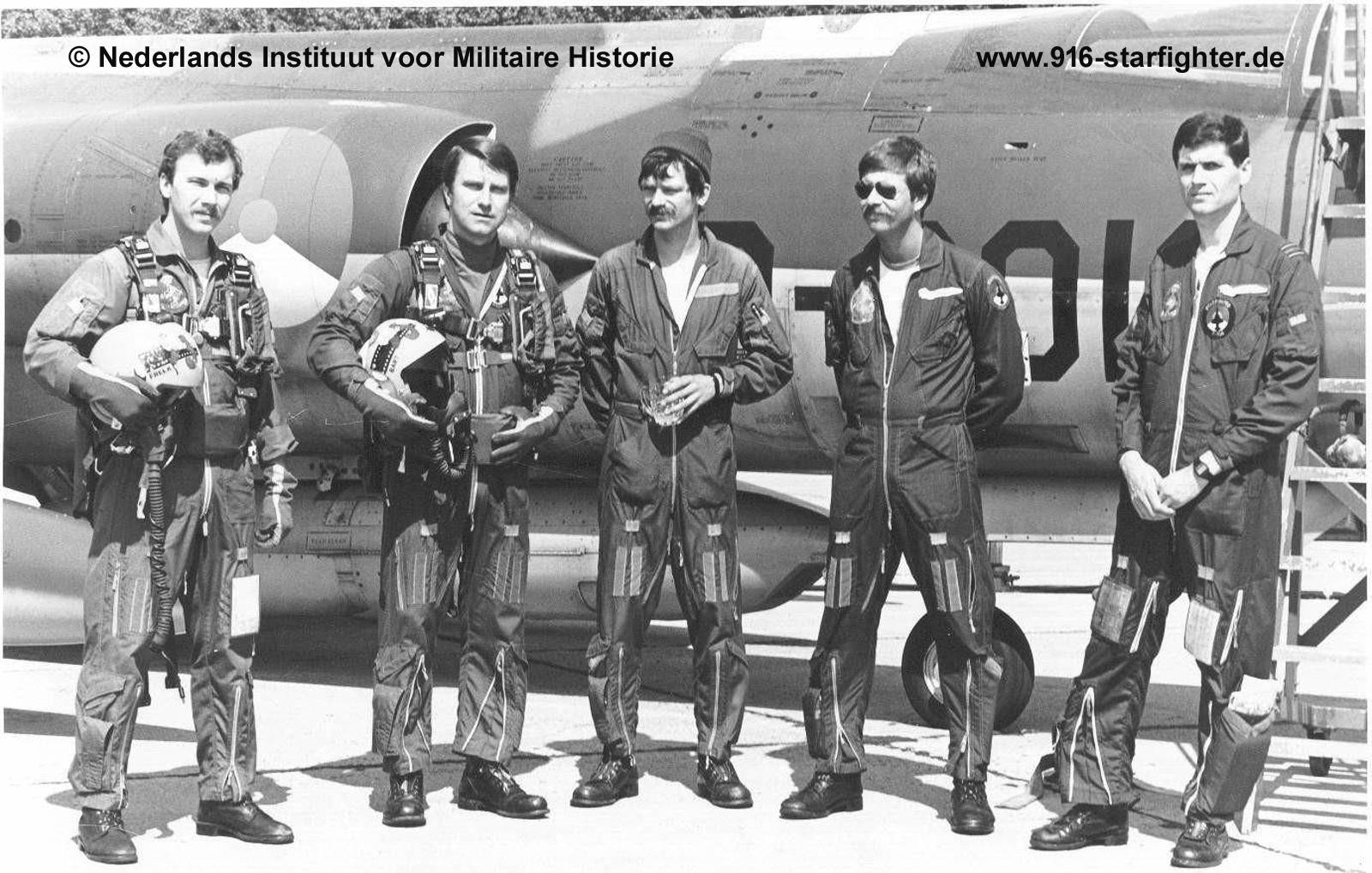 pilots of 306 Recce squadron Koninklijke Luchtmacht (KLu) during TAM 82 competition at Jever AB 1982 pilots left to right: Freek Willekens; Bart Leenen; Hein Gorris; Fred van Heukelom and Joop Bakker copyright © NIMH