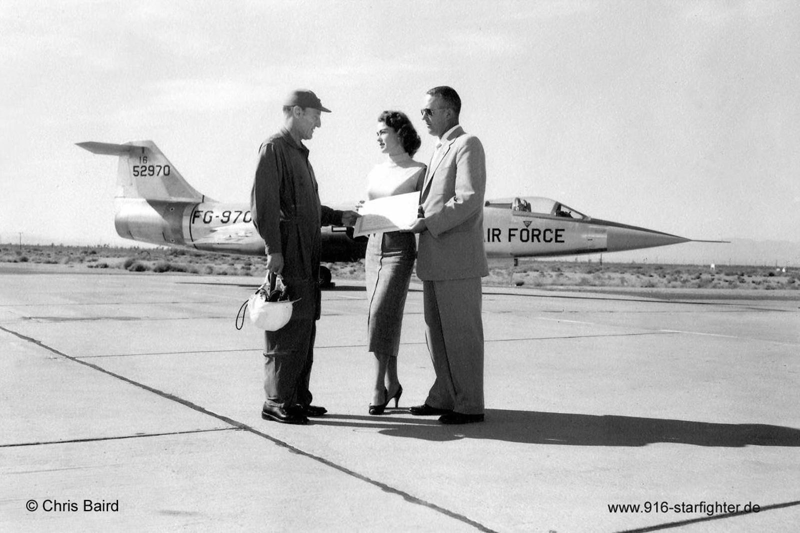 Major General Albert Boyd receives the "Order of Starfighters" certificate number #3 on October 9, 1956 YF-104A construction number 183-1016, model 183-93-02, US serial number 55-2970, built by Lockheed first flight February 17, 1956, ready for delivery September 18, 1956, acceptance by USAF September 18, 1956 delivery date January 31, 1957, and used as BLC test bed, crashed May 25, 1957 near Barstow, pilot Arthur Joseph Peterson was safe, written off It crashed 12:20 hours PST at San Bernardino, 20 N Miles NW of Camp Irwin on Leach Gunnery Range, in California during an gun shooting test mission after encountering a compressor failure. Pilot, Lockheed Engineering Test Pilot, Arthur Joseph Peterson tried several airstarts which were not successful. Then he ejected safely at 2.500 feet Aircraft took off from AF Plant 42, Lockheed, California, a flight which lasted 21 minutes before the crash. After the accident the engine was shipped to Evandale for study, results are unknown. Previous testflights have shown that gun debris (links and shell cases) from the T-17 E-3 gun when fired in flight from the F-104A strike the fuselage and ventral fin in a random manner from an area in line with the engine inlet air ducts aft. A fix to this problem consisting of installing an 8"x16" vertical steal deflector plate in front of the shell case and link ejection chutes had completed wind tunnel tests and was being flight tested. Tests were not complete but were not progressing satisfactorily as the fuselage and ventral fin continued to receive random strikes from the gun debris. The accident occurred during the fifth flight (fourth flight that the guns were fired) in a planned series of flights to test the deflector plate. The test aircraft was F-104A 55-2970 on bailment to Lockheed Aircraft Corp (LAC) flown by Peterson, an LAC Engineering test pilot. The chase aircraft was an USAF F-100 from Edwards Air Force Base flown by Capt Carson, an ARDC Engineering test pilot. The purpose of the flight was to fire a two second burst in a two "G" pull out at 400 Kts, then fire the remainder of a full ammunition load (760 rounds) in a two second bursts at one "G". copyright © Lockheed archive via Chris Baird