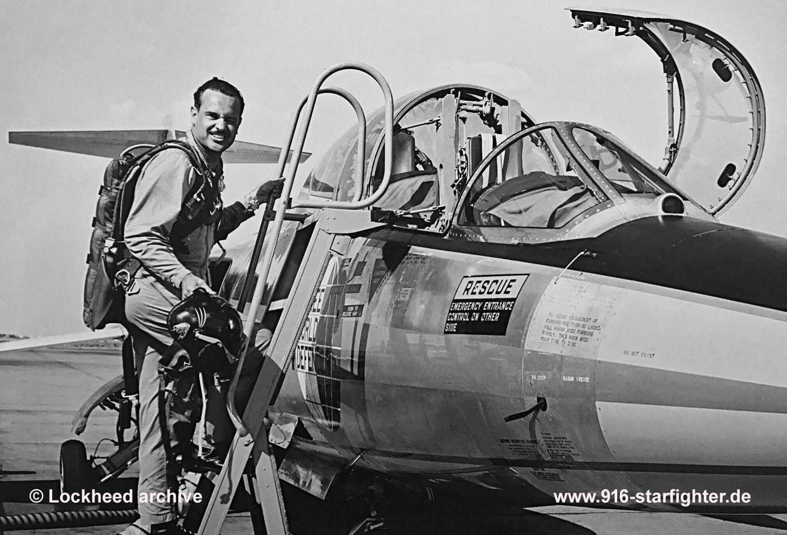 Lockheed Chief Test Pilot Glenn "Snake" Reaves, called „Snake“ (Schlange) stepping into TF-104G nicknamed "Free World Defender" at Palmdale TF-104G, construction number 583D-5702, model 583-10-20, built by Lockheedwhich was retained by Lockheed as a demonstrator It carried the civil registration number: N104L/N90500 and was nicknamed "Free World Defender" The well known aviatrix Jacqueline Cochran set two women's world's speed records.
