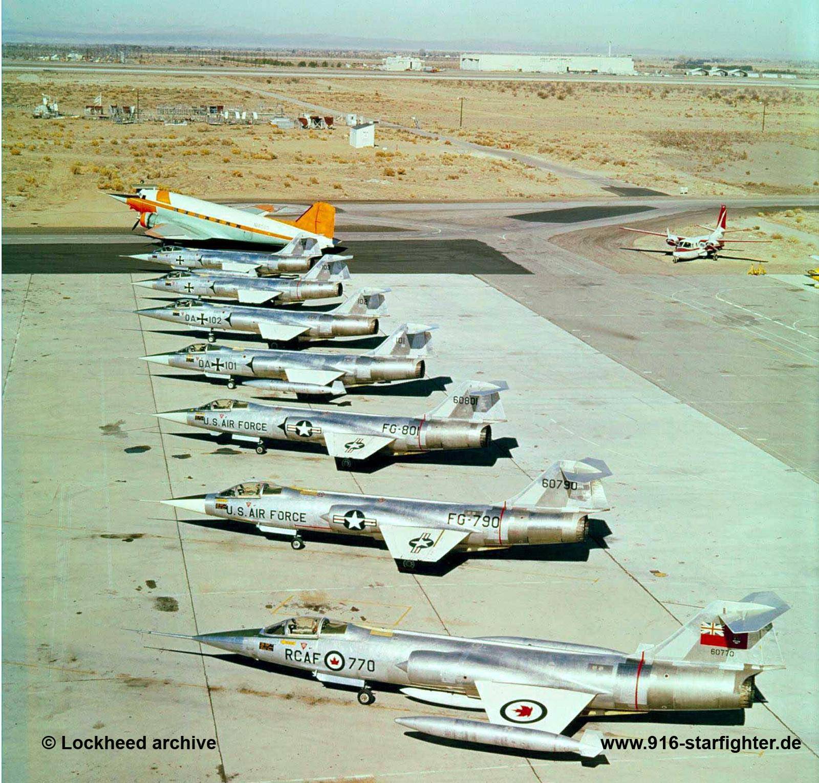 F-104G "DA+101" on Palmdale line early 1961 F-104G, construction number 683-2001, model 683-10-19, built by Lockheed 1st German Starfighter manufactured by Lockheed (ARGE-USA); first flight October 5, 1960 coded "101"DA+101 1960 to "Joint Test Force" at Edwards AFB for testing of electronics and fire control systems; airlifted to Germany August 7, 1962 with 261 flight hours in Silver-finish colors reassembled August 11, 1962 according project "Replace" with modification as Fighterbomber with Vulcan M61 20 mm machine gun installed and long range tanks as loose parts coded KE+101 for test flight January 22, 1963; acceptance date March 29, 1963 by BABwMTT DA+101 JaboG 31 at Norvenich AB delivery date on April 2, 1963, camouflage scheme "Norm 62" according tech order "TA-196" in 1965 20+01 1st F-104G of the Luftwaffe with 2000 flight hours on January 11, 1974 withdrawn from use at LwSchleuse 11 on May 2, 1983; struck off charge order (AVA) December 18, 1984