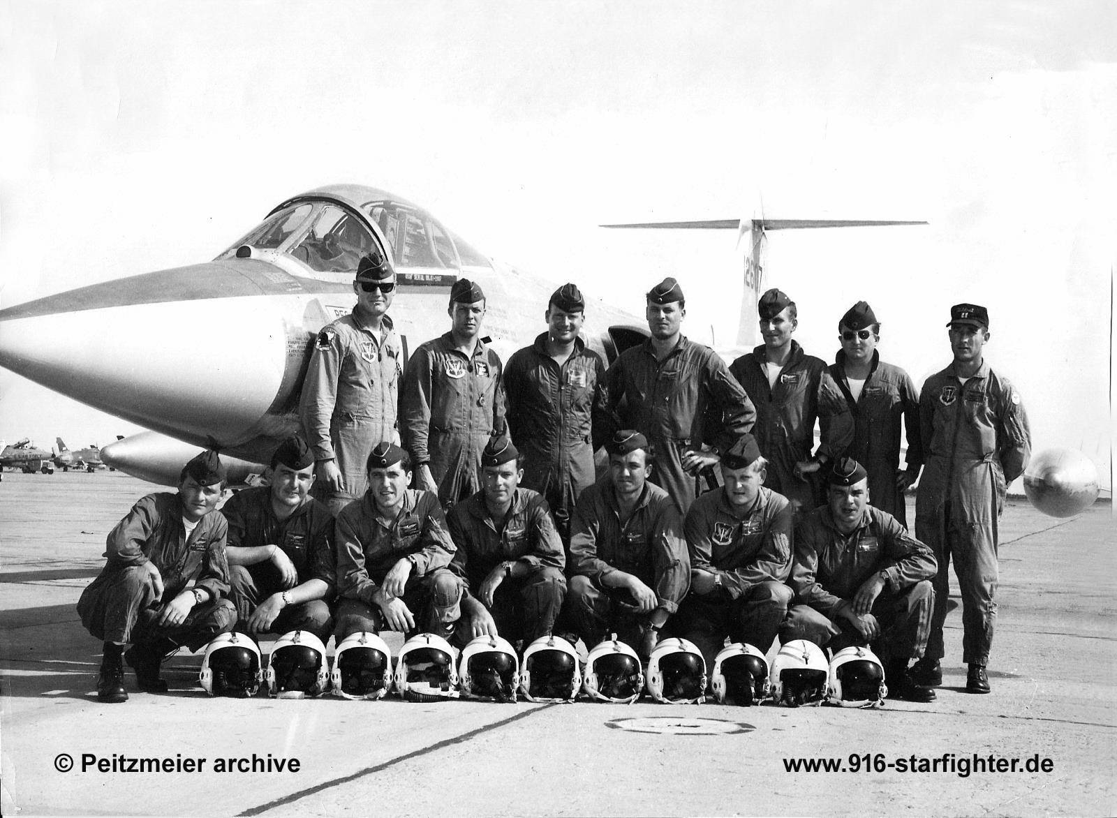 Training Course F-104 Juli/August 1966 at Luke AFB Members of the course: back row (left to right): Capt Jack Glover, Capt Johnny Olsen, Hauptmann Lutz Mundhenk, Hauptmann Peter Seidler, Fw Hartmut Tröhler, Fw Hansachim "Joe" Müller, Capt Rudman front row (left to right: Fw Gerhard Schöpke, Fw Ingo Duda, Olt Willy Niehaus, Hauptmann Joachim Hameyer, Albert Michel, Fw Leonhard Austermann, Dieter Brüssow. copyright © Peitzmeier archive