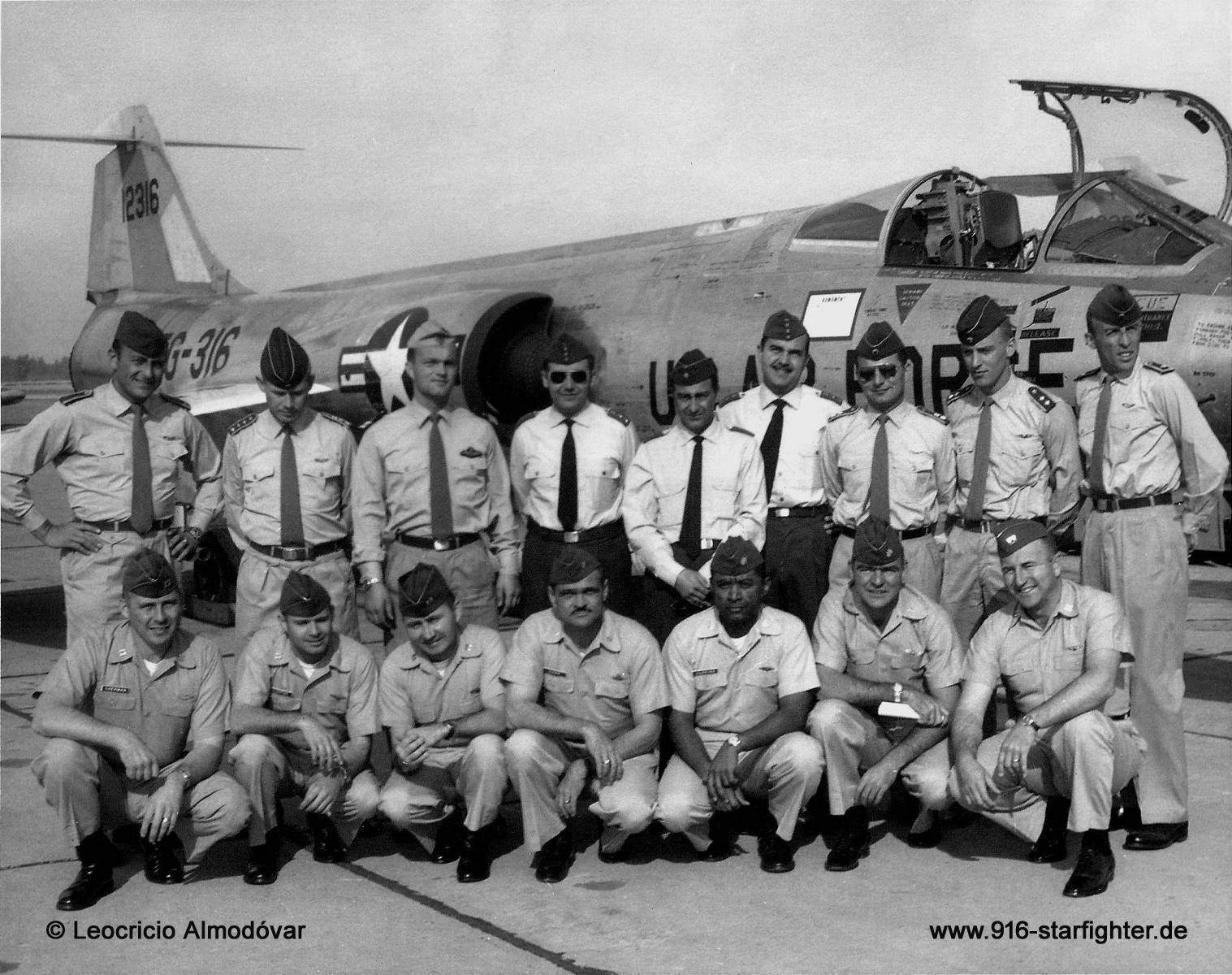 Training Course 111502G F104G, Class 65-C Luke AFB 1964 at Luke AFB Course started in November 1964 and graduated February 5, 1965. Members of the course: back row (left to right): SU Joe Funk, Hptm Norbert "Blinky" Becker, KptLt Klaus Stemmler, Capt. Conejero Lillo (Angel), Major Baudot Mansilla (Carlos), Capt Almodóvar Martinez (Leocrizio), OLt Reinhard Schmitz-Irmer, OLt Siegfried Schöllhorn, Fw "Charly" Stöger. front row (left to right: Capt James Sherman, Capt Duane Kloepfer, Capt Joe Nevers, Major William Gunn, Major Asa Herring, unknown, Capt Karl Hoffman. 4443rd CCTS (MAP program) When the 434th TFS "Red Devils" of the 479th TFW George AFB, 831st Air Division disbanded on January 3, 1962 it became the initial F-104G training squadron and was designated 4443rd CCTS. The 4443rd CCTS of the 479 TFW at George Air Force Base conducted training for German type transition pilots in about 23 hours training in the F-104D from 1962 until May 22, 1964. Early 1962: 1.Provisional F-104 Training Course (JG 71 and JaboG 33) The 4443rd CCTS moved to Luke AFB and came under control of the 4540th CCTG at Luke AFB, Arizona effective August 1, 1964 as the initial MAP/NATO F-104G training unit. The 4443rd CCTS and the 4540th CCTG disbanded on September 30, 1966 copyright © Leocricio Almodovar