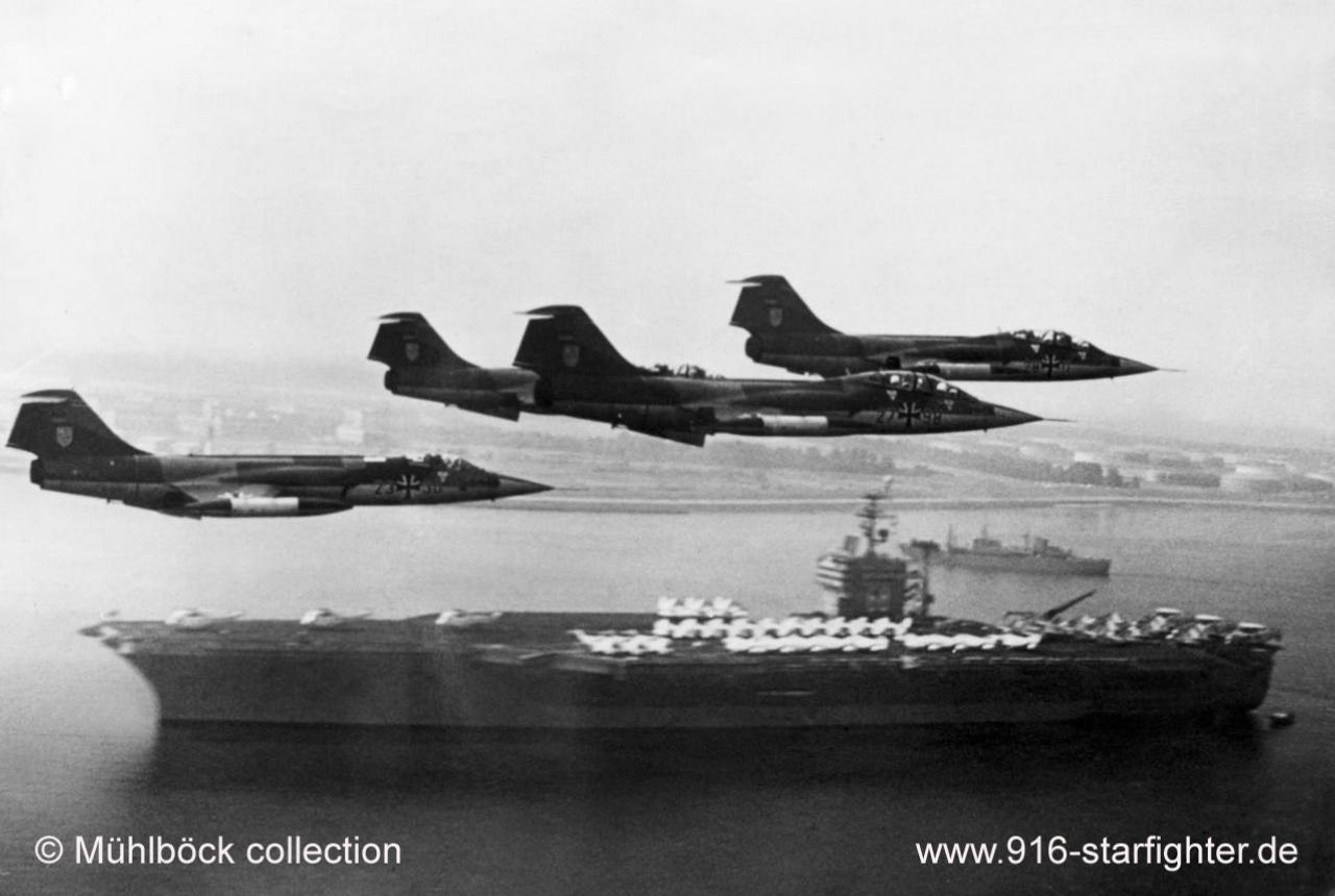 German F-104 4 ship from WaSLw 10 saluting "USS Nimitz" aircraft carrier in Wilhelmshaven port in August 1975 The keel of Nimitz was laid down 22 June 1968 by Newport News Shipbuilding in Newport News, Virginia. She was christened in 1972 by Catherine Nimitz Lay, the daughter of the late Admiral Nimitz. Nimitz was delivered to the Navy in 1975, and she was commissioned at Naval Station Norfolk on 3 May 1975 by President Gerald Ford. USS Nimitz (CVN-68) is a supercarrier of the United States Navy, and the lead ship of her class. One of the largest warships in the world, she was laid down, launched and commissioned as CVAN-68, but was redesignated CVN 68 (nuclear-powered multimission aircraft carrier) on 30 June 1975 as part of the fleet realignment. The ship was named for World War II Pacific fleet commander Chester W. Nimitz, who was the navy’s third fleet admiral. Unlike all of the subsequent Nimitz class aircraft carriers, Nimitz only uses her namesake's surname as is common for naval officers. She is also the first carrier of her class and the most recent supercarrier in service not to be named for someone who held elected office in the United States. copyright © Mühlböck collection