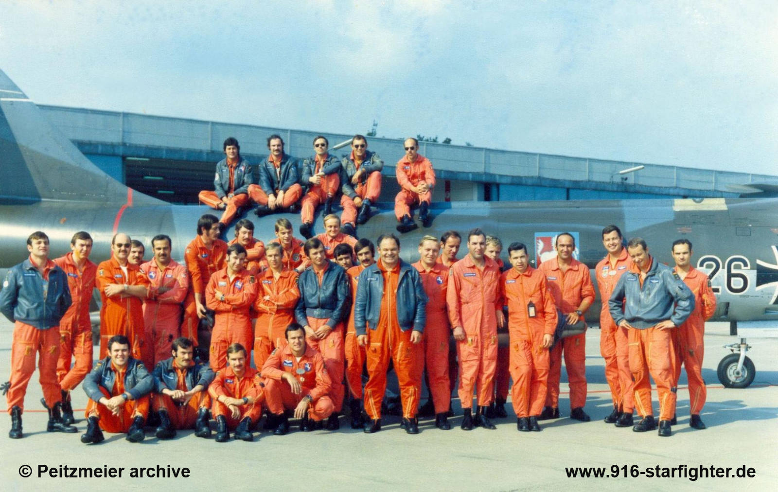 Jagdbombergeschwader 36 pilots in September 1972 front row from left: Neuenfeld, Gernhuber, Hopf, Ralser standing from left to right: Mildenberger, Kuhlen, Freese, Esther, Hein, Schumann, Hassenewert, Ludwigs, Girnus, Brose, OTL Weilnböck (Kdr FlgGrp), "Doc" Schneider, Rusche, Simonis, Schulte-Bisping, Stephan, Treiber, Hoppe, Schmidt, Knöllinger sitting on the wing from left: Pauli, Walbeck, Ortmann, Beyer sitting on the fuselage from left: Nebel, Feuersenger, Speetzen, Miller, Becke. copyright © JaboG 36 archive via Hubert Peitzmeier