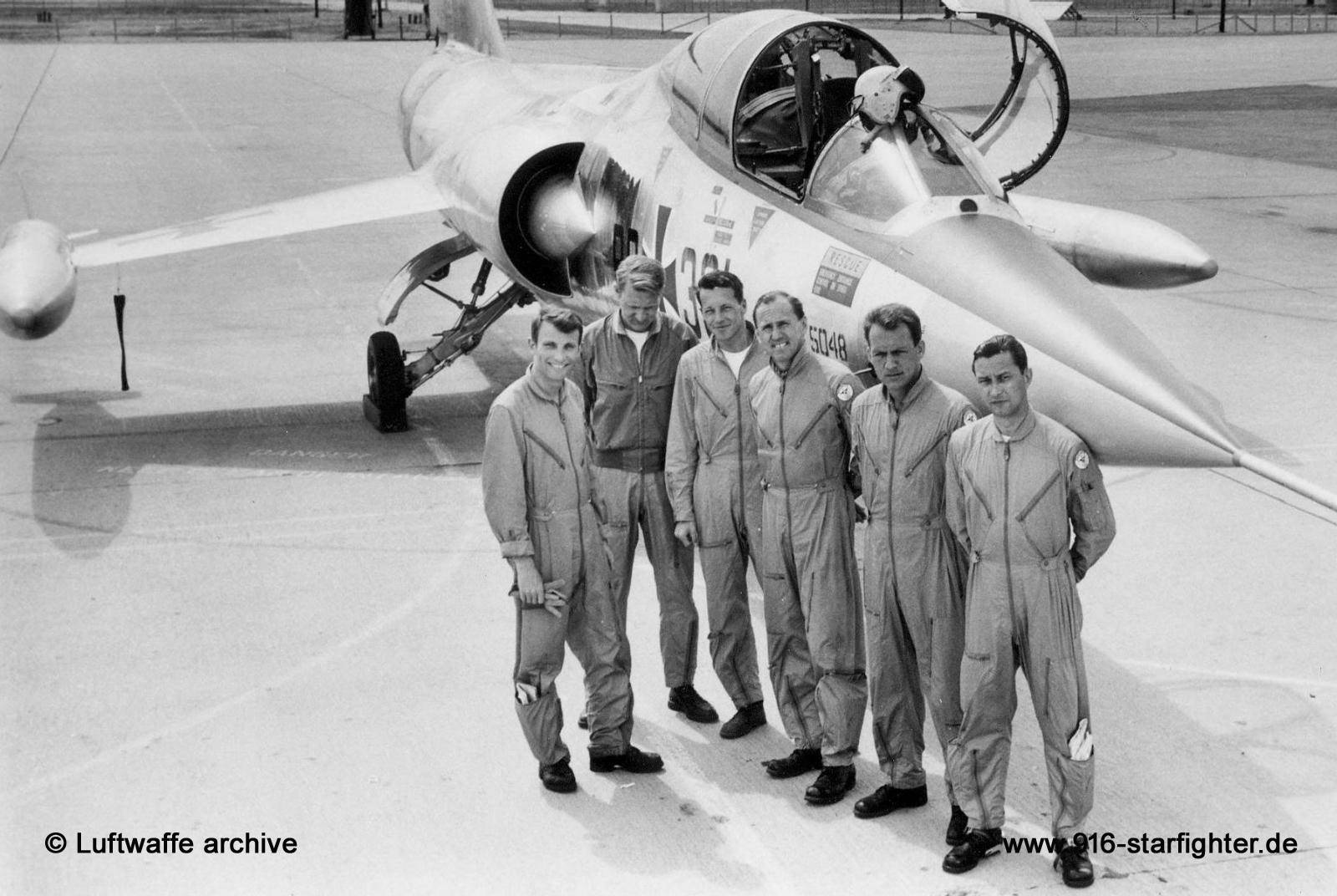 February 15, 1960 started at Lockheed in Palmdale, California the first "Conversion Flight F-104F" (Umschulungslehrgang) Participants (Lehrgangsteilnehmer): OTL Rall Leiter des Arbeitsstabes F-104 im FüL - BMVg Hptm Flade Olt Schultz Olt Klemm Lt Kuebart Olt von Stürmer After 10 days of academics started the flying training, at Palmdale, consisting of 26 flights with about 32 flight hour for each pilot. After returning to Germany in April 1960 these pilots started the pilot training of Waffenschule 10 at Norvenich AB (4.Staffel Waffenschule 10, F-104F Ausbildungsstaffel). OTL Rall returned to his office with FüL of the Air Force. copyright © Luftwaffe archive
