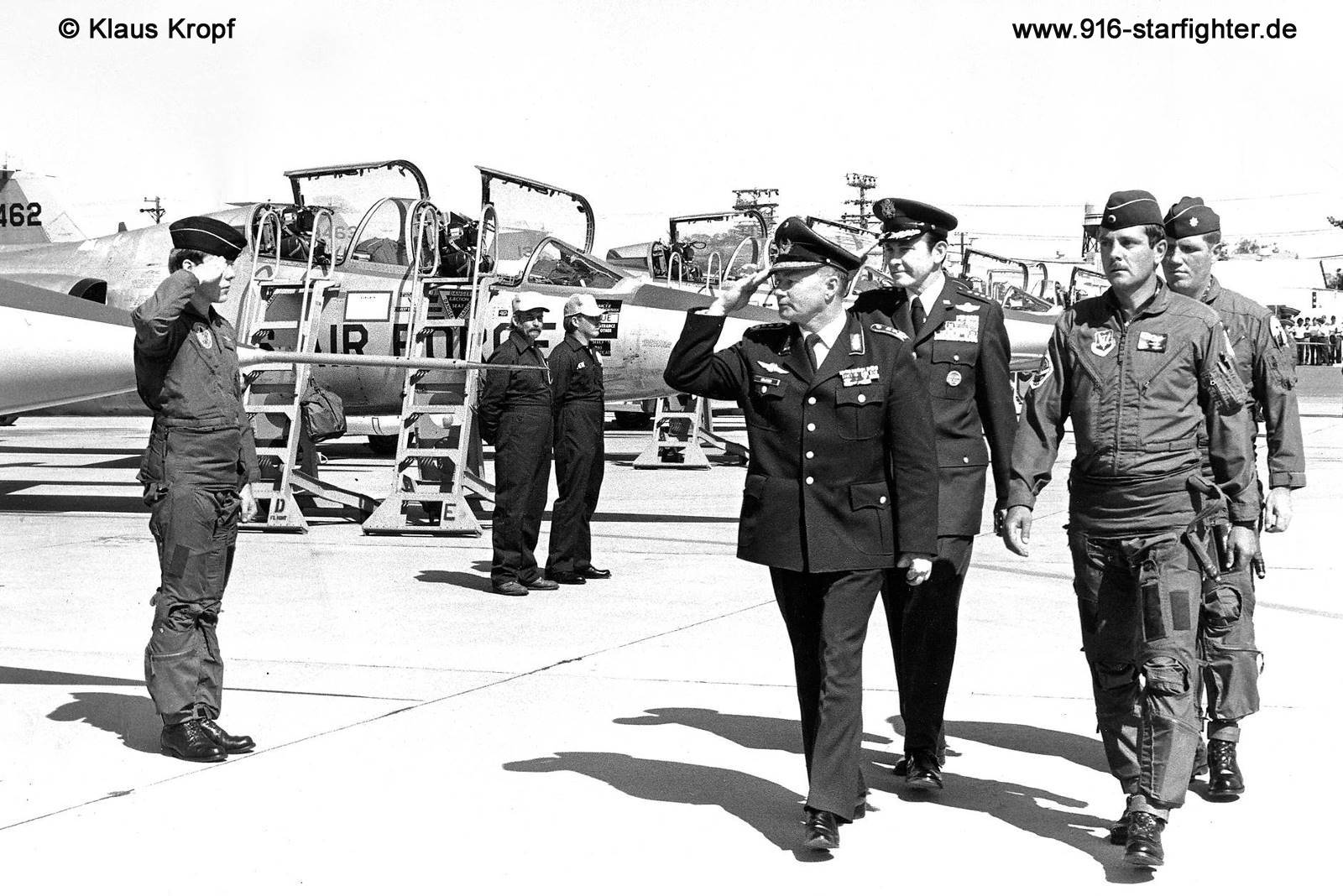 Luftwaffe training in the USA: on March 16, 1983 ended the F-104 training program at Luke AFB Gen Obleser and Gen Creech (USAF) with LtCol Thüringer and LtCol Patterson (USAF) inspect the last formation Both the 2nd German Training Squadron and the 69th Tactical Fighter Trainung Squadron were deactivated. copyright © Klaus Kropf archive