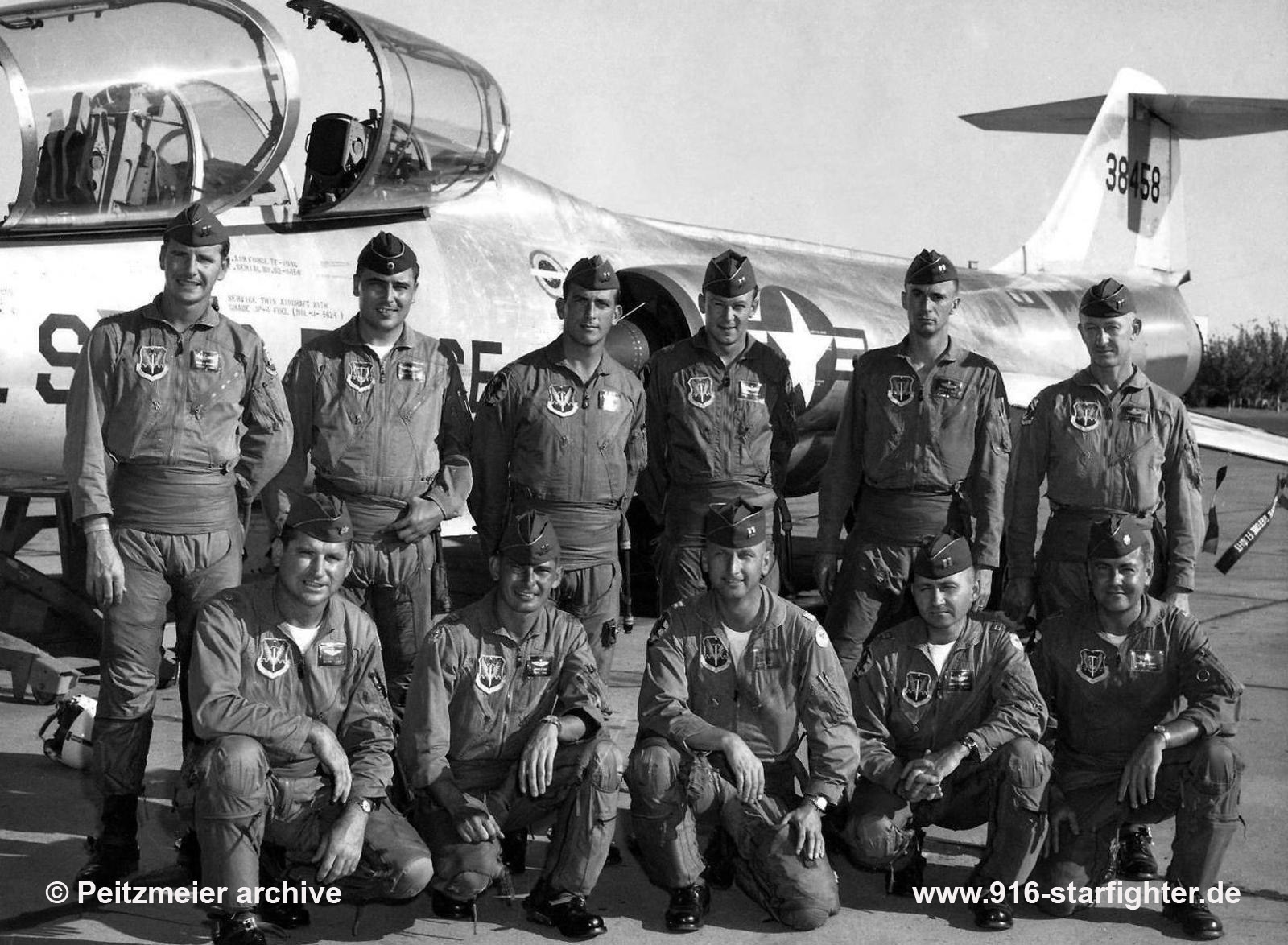 Luke IP's in June 1965 What a wealth of experience is embodied in the eleven men shown. They are all assigned as instructors at Luke AFB, Arizona in the F-104 German Pilot Training Program. Each pilot has flown more than 1,000 hours in the J79-powered F-104. Left to right front row, with flight times, Maj. R.E. "Bob" Messeril (1,849), Capt. J.P. "Jack" Gee (1,588), Capt. B. E. "Boyd" Squire (1,520), Capt. J.R. "Joe" Nevers (1,665), Maj. W.E. "Wally" Durst (1,000) Back row, Capt. D.W. "Dave" Brown (1,419), Hauptman Bodo Koppe (GAF 1,100), Capt. B.R. "Bob" Noack (1,146), Capt. F.J. "Frank" Schmidt (1,048), Capt. W.T. "Bill" Smith (1,479), and Capt. B.B. Huffman (1,479). copyright © Peitzmeier archive