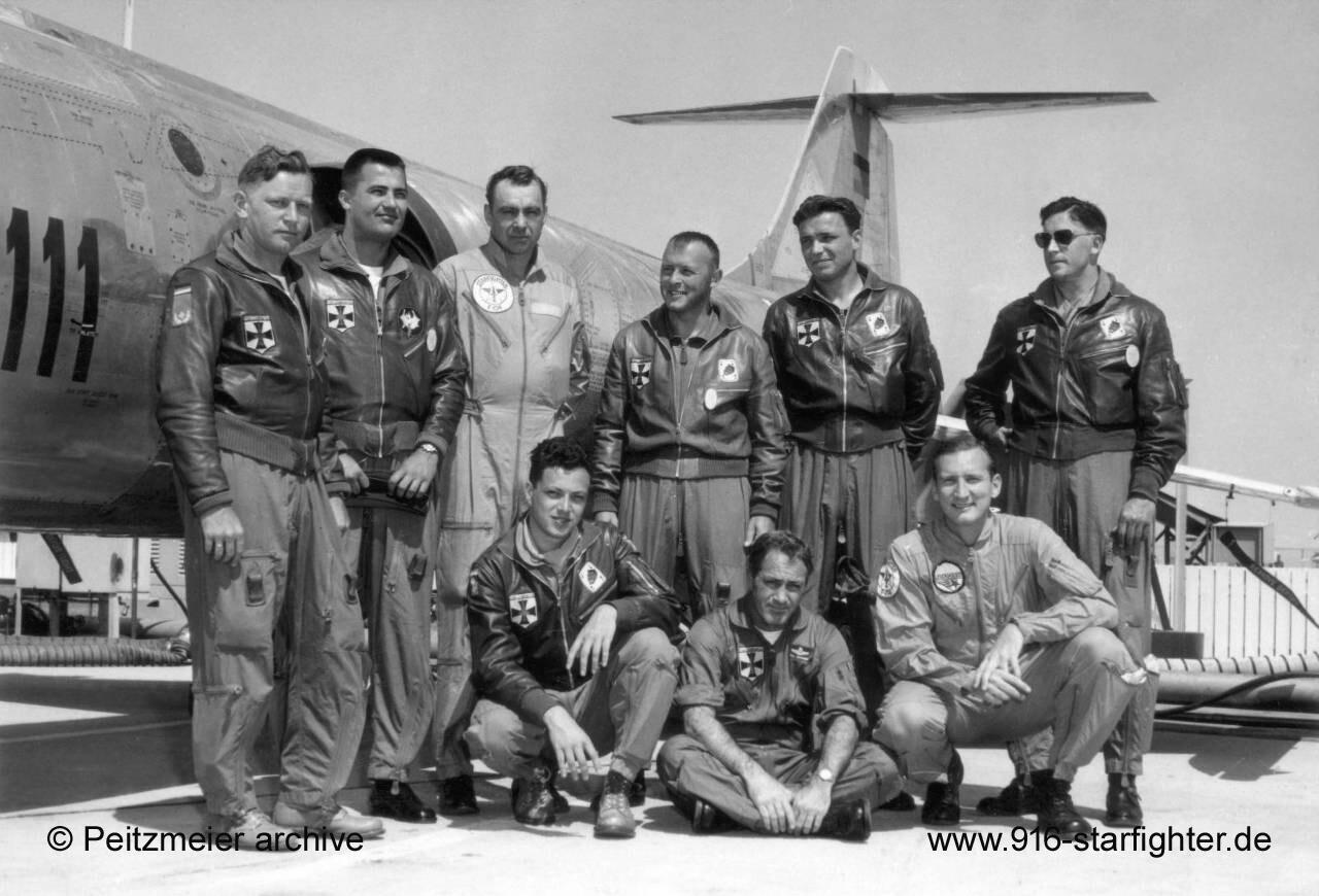 End of 1961: instructor training with Lockheed at Palmdale for JaboG 33 standing from left: Maj Mohrdiek, Olt Rudolf, Bob Vannet (Lockheed), Olt Weber, Hptm Seebeck, Hptm Schulz-Röhl front row from left: Olt Hufnagel, LtCol Johnson (USAF), Bob Gilliland (Lockheed). copyright © Klaus Kropf via Peitzmeier archive