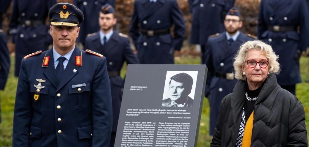 Jürgen Schumann in a F-104G at Luke AFB during his pilot training 1965 Schumann joined the German Air Force in 1960 and began his flying career at Büchel Air Base, where he flew the F-104 Starfighter with JaboG 33 from 1965. After retiring as a Captain (Hauptmann) in 1968, he became a civilian pilot with Deutsche Lufthansa and as such was the captain of the Lufthansa plane 'Landshut', which was hijacked on October 13, 1977. On October 16, 1977, during a stopover in Dubai, he was able to provide the authorities with information about the number of hijackers of the 'Landshut'. Due to an interview with the Defense Minister of Dubai (Muhammad ibn Rashid Al Maktoum, Prime Minister and Vice President of the United Arab Emirates and Ruler of Dubai since January 4, 2006), the kidnappers also found out about it, whereupon the leader of the hostage-takers, Zohair Youssif Akache, the flight captain in the Gang got to his knees and threatened to shoot him if another incident happened. After landing on October 16, 1977 at Aden Airport (then South Yemen) on a strip of sand next to the runway (because the local government had all runways blocked and the plane could not reach any other airfield due to lack of fuel), Schumann left the airplane with the permission of the kidnappers to control the landing gear. He also took the opportunity to speak in an airport building about the possibility of the hostages being released. He then voluntarily returned to the hijacked machine. On board, Akache shouted him down in the aisle of the plane and shot him in the head. Akache did not give Schumann the opportunity to explain the reasons for his absence. On October 13, 1977, a Palestinian terrorist commando hijacked the Lufthansa plane 'Landshut' - the odyssey went via Rome, Larnaka, Dubai and Aden to Mogadishu. The kidnappers demanded the release of eleven RAF terrorists imprisoned in Germany. On October 16, 1977, they shot flight captain Jürgen Schumann in Aden. On October 18, 1977, a commando of GSG 9 successfully freed all the hostages. However, employer president Hanns Martin Schleyer, who was kidnapped by the RAF in parallel with the 'Landshut' hijacking, was murdered. The barracks of the German Air Force in Schleswig-Holstein's Appen (Pinneberg district), which houses the non-commissioned officer school of the service, was renamed. The new name: 'Jürgen Schumann barracks'. The Inspector of the Luftwaffe, Lieutenant General Ingo Gerhartz, officially informed the troops of the name change in a daily order on March 26, 2021. November 24, 2021, the German Air Force will honor one of its former pilots who probably stands most clearly for all the positive aspects of his job: Jürgen Schumann, the captain of Lufthansa flight LH-181. The Inspector of the Air Force, Lieutenant General Ingo Gerhartz, together with Monika Schumann at the stele commemorating her husband Jürgen, who was murdered by terrorists in 1977. copyright © Grondstein collection