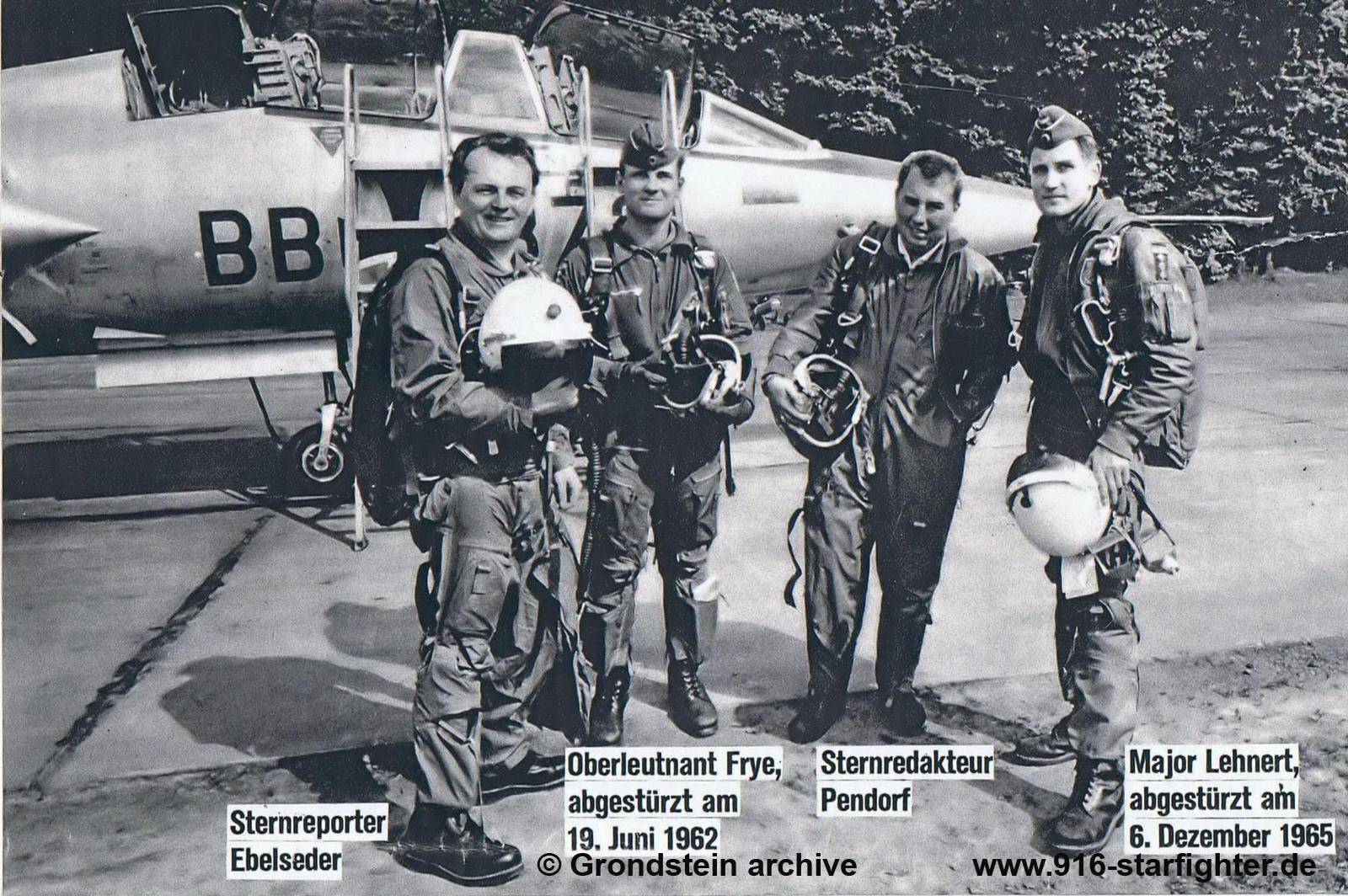 Hptm Lehnert and Oberleutnant Frye of Waffenschule der Luftwaffe discussing the flight in 1962 Hptm Klaus Lehnert, Jagdbombergeschader 31 (FBW 31), Norvenich Maj Klaus Lehnert crashed on December 6, 1965 near Narwik, Norway due to engine flame-out (no more fuel) after take-off from Norvenich AB, pilot got incapacitated due to oxygen problems. Take off time 17.09 hours Norvenich AB, heading North at approx. 40.000 ft on Autopilot, after 11 min all radio contact was lost, crash time 19.41 crashed at Emmenes, Ankenes, just 4 km south west of Narwik, Norway after running out of fuel. First intercepted in Denmark by two F-100, then intercepted by two F-104G from 331 Sqn Bodø, they flew very close to DA+254 so the lights were lightening up the cockpit to the pilot, the pilot was unconscious or dead due to oxygen problems. copyright © Grondstein archive