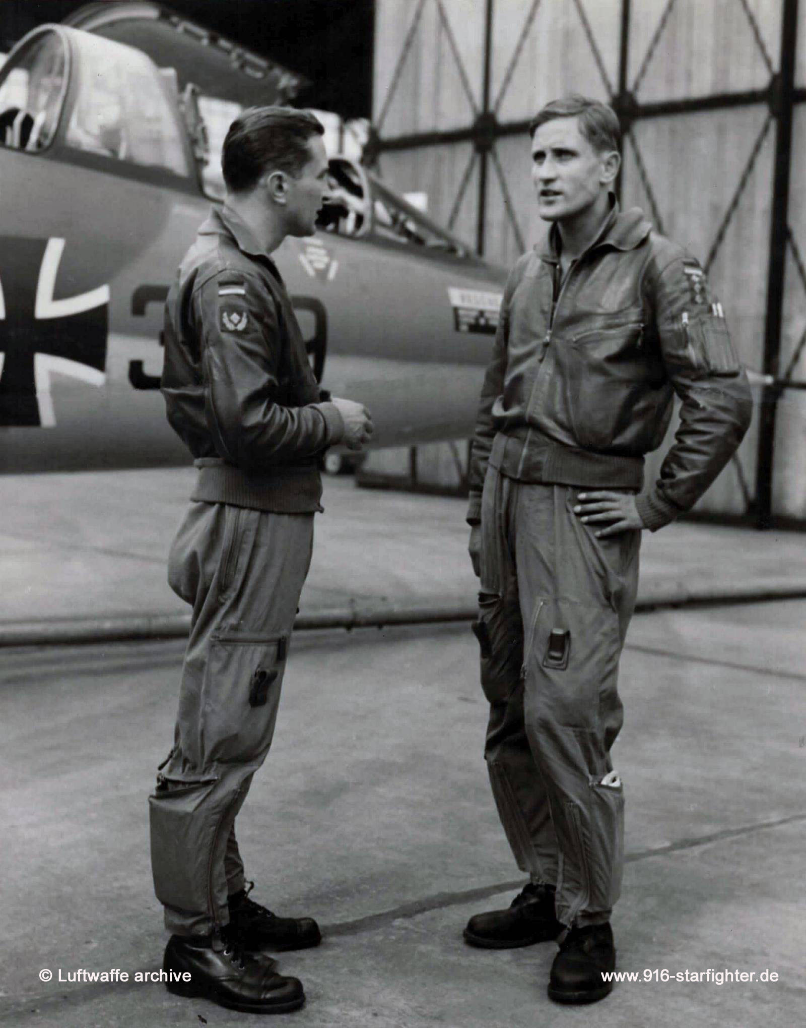 Maj Flade discussing with Hptm Lehnert the pilot training at Waffenschule der Luftwaffe 1962 Maj Flade, Staffelkapitän 4./Waffenschule der Luftwaffe 10 (OCU 10), Nörvenich Hptm Klaus Lehnert, Jagdbombergeschader 31 (FBW 31), Norvenich Maj Klaus Lehnert crashed on December 6, 1965 near Narwik, Norway due to engine flame-out (no more fuel) after take-off from Norvenich AB, pilot got incapacitated due to oxygen problems. Take off time 17.09 hours Norvenich AB, heading North at approx. 40.000 ft on Autopilot, after 11 min all radio contact was lost, crash time 19.41 crashed at Emmenes, Ankenes, just 4 km south west of Narwik, Norway after running out of fuel. First intercepted in Denmark by two F-100, then intercepted by two F-104G from 331 Sqn Bodø, they flew very close to DA+254 so the lights were lightening up the cockpit to the pilot, the pilot was unconscious or dead due to oxygen problems. copyright © Luftwaffe archive