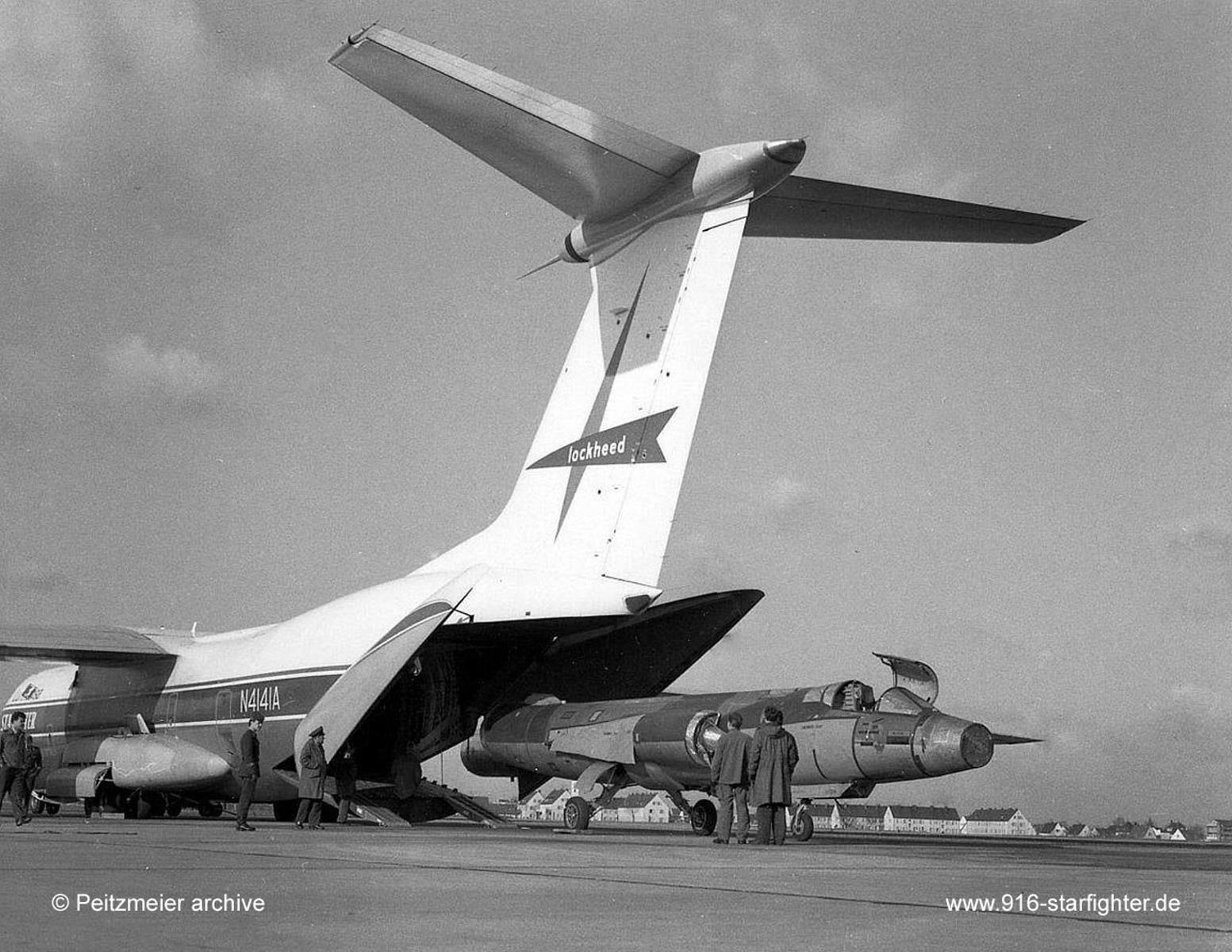 F-104G loaded on a Lockheed "L-300 Starlifter" at Manching AB 1967 Flightline of the Messerschmitt-Manching factory, a F-104G is ready to be airlifted to the USA on April 19, 1967 with Lockheed L-300 cargo aircraft (Starlifter) to Lockheed-Palmdale, USA. copyright © Peitzmeier archive