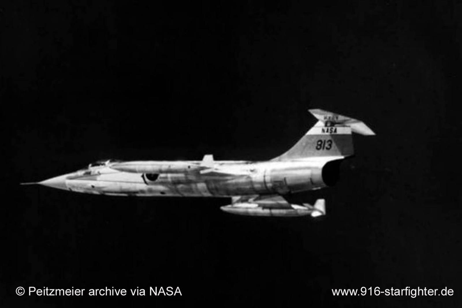 F-104N "NASA 813" just prior to the midair collision with XB-70 in 1966 F-104N, construction number 683C-4058, model 683-10-19, built by Lockheed, registered N813NA arrived at the Flight Research Center on October 22, 1963 with 4.75 flight hours on the airframe for high speed chase flights. It was piloted by Joseph A. Walker, and wore NASA tail number 013. Within a week, four other NASA pilots also flew 013. On November 1, 1963, Walker flew NASA 013 to "Yuletide" Special Operations Area northeast of Groom Lake, Nevada. The flight was in support of the X-15 program. NASA 013 frequently served as chase aircraft for the X-15. The aircraft made its 235th flight coded NASA 013 on March 5, 1965, again piloted by Walker. On its next sortie, flown by Milton O. Thompson on March 8, 1965 the aircraft had been redesignated NASA 813. On November 29, 1965, Joe Walker flew NASA 813 as chase for the XB-70. Walker had been selected to become NASA's chief XB-70 pilot. He made four additional XB-70 chase flights in November and December 1965, and seven more in March 1966. During its three-year service life, NASA 013 (later 813) flew a total of 409 NASA sorties and logged 627.7 flight hours. It was flown by nine different NASA pilots including Joseph A. Walker, Milton O. Thompson, Bruce Peterson, John "Jack" McKay, Donald Mallick, William H. Dana, Fred Haise, John Manke and flight surgeon Dr. James Roman. Walker made 165 of the flights, more than any other pilot. The aircraft was lost in a midair collision with the XB-70A-2 Valkyrie on June 8, 1966. copyright © Peitzmeier archive via NASA