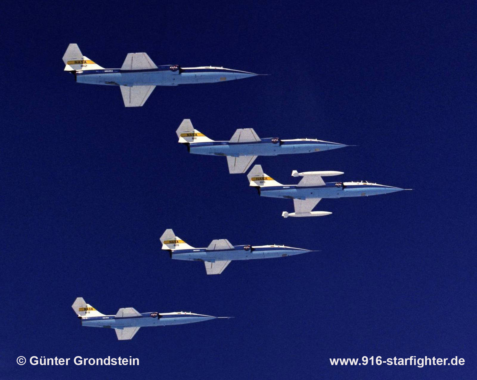 F-104 NASA Dryden aircraft fleet April 11, 1975 showing: NASA 811 F-104N, NASA 820 F-104A (modified G), NASA 812 F-104N, NASA 819 F-104B and NASA 818 JF-104A. Even on a day when there were no research or support flights scheduled, Center pilots would find a reason to fly the Starfighter. Such was the day of April 11, a Friday in the year of 1975. The previous day it had rained and now, although cloudy, the sky was clearing. It was an ideal setting for an airborne photo mission. One young enterprising pilot, Gary Krier, recognized the "knock of opportunity" and seized the moment. Quickly he organized and obtained approval to fly the mission. By 8:30 a.m. you could look out at the DFRC staging ramp and see five blue-and-white Starfighters all in-line and ready for the mission at hand. At 9:15 a.m. the first Starfighter was airborne, followed in rapid order by the remaining four aircraft. The fifth Starfighter became airborne at 9:35 a.m. During the mission the aircraft were flown in several different formations with the photographer in the T-38 photo chase busily photographing. It was a photographer's dream come true. The mission also included formation fly-bys to the delight of the Center's employees. The mission lasted just over an hour. Participants in this operation were: Fitz Fulton/Ray Young, flight-test engineer (F-104-819 [303]), formation leader, Bill Dana (F-104 [811]), Tom McMurtry (F-104 [812]), Einar Enevoldson (F-104-818 [961]), Gary Krier (F-104-820 [790]) and Don Mallick and photographer Bob Rhine in the T-38. copyright © Günter Grondstein