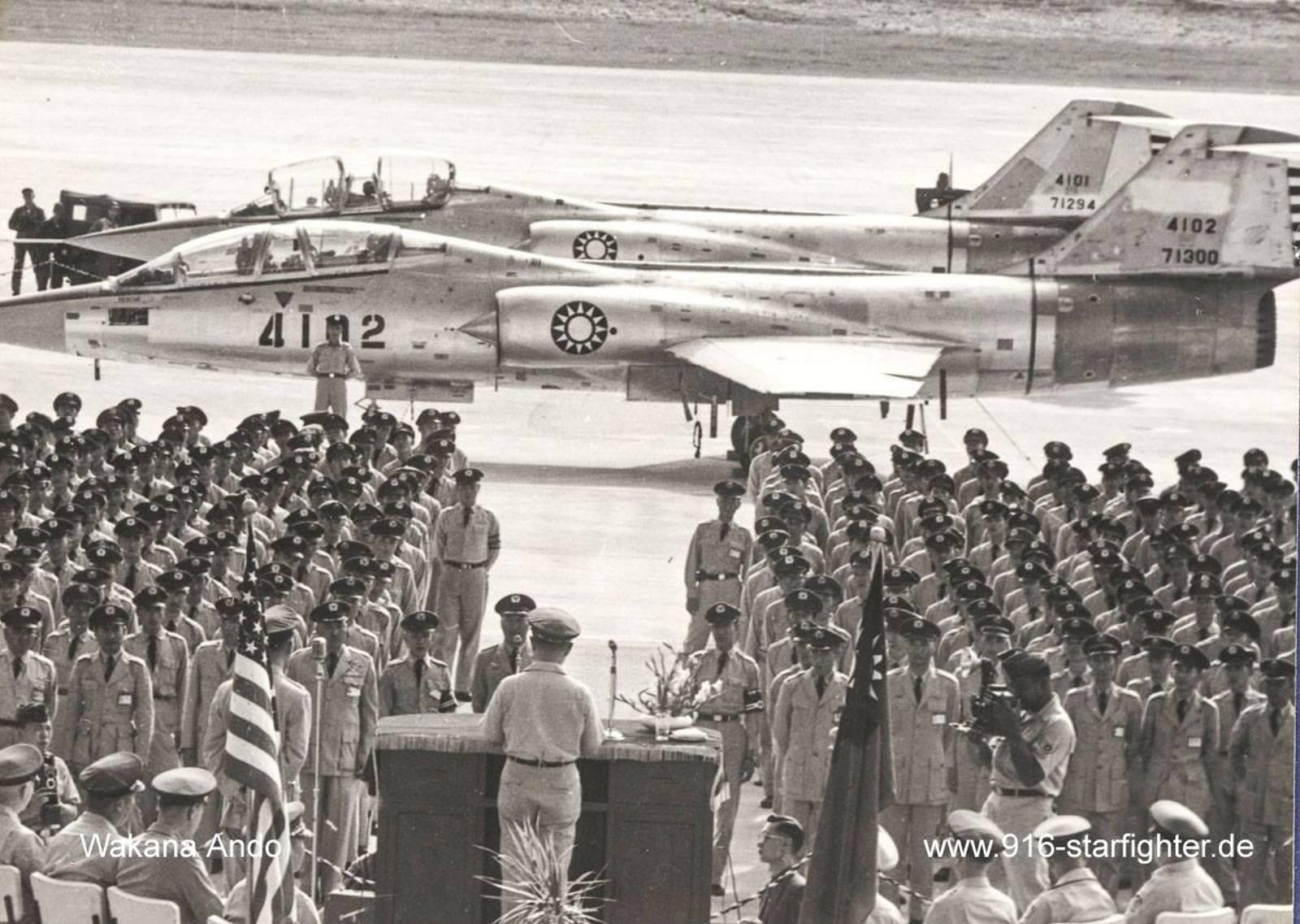 "4102" F-104B 57-1300 ROCAF, the first Starfighter for 8 TFS of 3 Wing at Kung Kuan Air Field (CCK) May 26, 1960 Reception ceremony of F-104 at CCK AFB on May 26, 1960. Only two F-104B coded 4101 and 4102 were there. Since 1960 eight F-104B and six F-104D Starfighters have been used by the Taiwanese Air Force of which the remaining aircraft flew their operational missions well into the eighties. lt all started in 1960 when the 8 TFS of 3 Wing received five F-104B two-seat Starfighters as training aircraft together with the already received 22 single seat F-104A Starfighter. This project was called “Ali Mountain No.1”. The Starfighters stayed in use until 1966 when 3 surviving F-104B were given back to the USAF after being replaced by the more modern TF-104G version. Two F-104B had been lost in accidents during the 7 years of operation at CCK AB. copyright © Wakana Ando