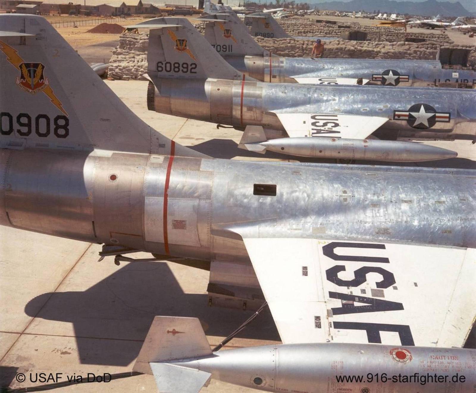 F-104C 56-0892 at DaNang, South Vietnam 1965 in USAF Silver-finish colors F-104C, serial number 56-0892, construction number 183-1180, model 583-03-04, built by Lockheed delivery date October 16, 1958; 479th Tactical Fighter Wing; George AFB, California (October 1958-October 1967) 476Th TFS 1965 at DaNang AB, South Vietnam and Kung Kuan AB, Taiwan (April 19, 1965 - July 11, 1965); 435th Tactical Fighter Squadron (Pacific Air Forces) Udorn RTAFB, Thailand in late 1966/1967 198th TFS PR Air National Guard (October 1967-July 1975), damaged after emergency landing at San Juan, after a chute failure pilot did not engage the barrier, but steered into the dirt area to avoid the lagoon aircraft was repaired; withdrawn from use July 17, 1975 and transferred to Luke AFB; at Luke AFB, Arizona as Gate Guard coded "10+75" with F-104G tail of construction number 9012 in October 1975 showing "69-418" (being the numbers of the last two training squadrons) on right tail; later coded as "63-13243" of the 4510th CCTW (58th TFTW); October 2005 noted; October 2024 noted. copyright © USAF DoD archive