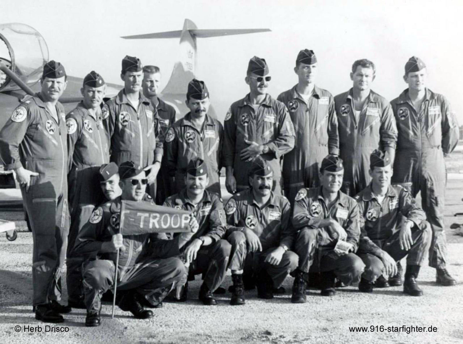 pilots of the 435th TFS in front of the quarters at Udorn RTAFB, Thailand 1967 copyright © Herb Drisco Back Row - Left to Right: Rodney Trimble, Bobby Bedsworth, Hugh Spencer, Ace Rawlins, Joe Nevers, Travis Harold, Denny Mangum, Bill Caffery, Arthur (Art) Poe Front Row - Left to Right: Tom Mahan, Herb Drisco (Flight Commander), Floyd Totten, Bob Preciado (435th TFS Commander), Bob McIntosh (Ops Officer), & Jimmy Trice.