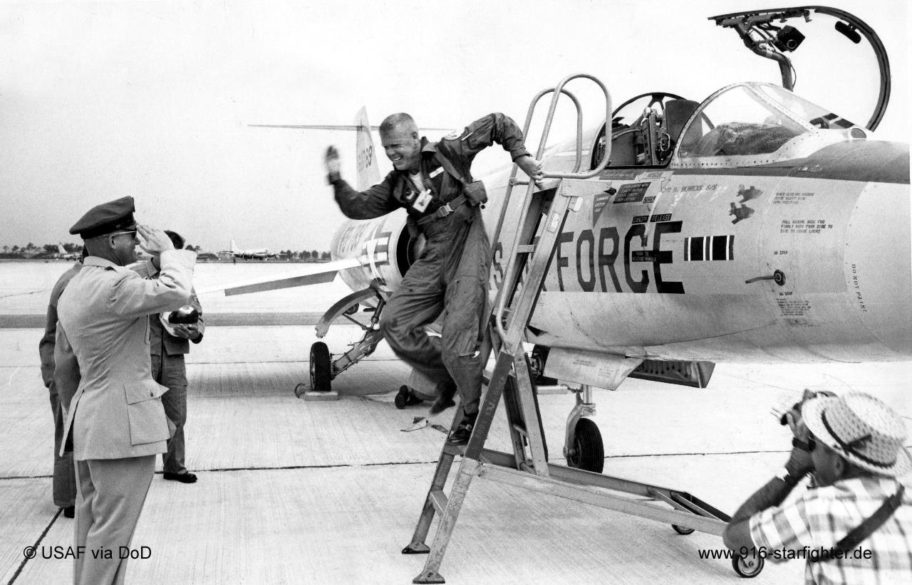 Col Benjamin King jumps off F-104A 56-0789 at MacDill AFB, indicating the arrival of the 4750 Drone Squadron in July 1559 From January 1957 until July 1959, General King was assigned as commander, 4750th Air Defense Group, and later as deputy commander and commander, 4750th Air Defense Wing at Vincent Air Force Base, AZ. He moved with the wing to MacDill Air Force Base, FL. F-104A, construction number 183-1077, model 183-93-02, US serial number 56-0789delivery date March 12, 1958, 4756th ADW, ADC (March 1958-July 1959) 4750th ADW 4750th TS at MacDill AFB, Florida (July 8, 1959-December 1959) November 1959 to 4750th Test Detachment (ADC), MacDill AFB, Florida; December 1959 to Sacramento Air Materiel Area, Palmdale, CA