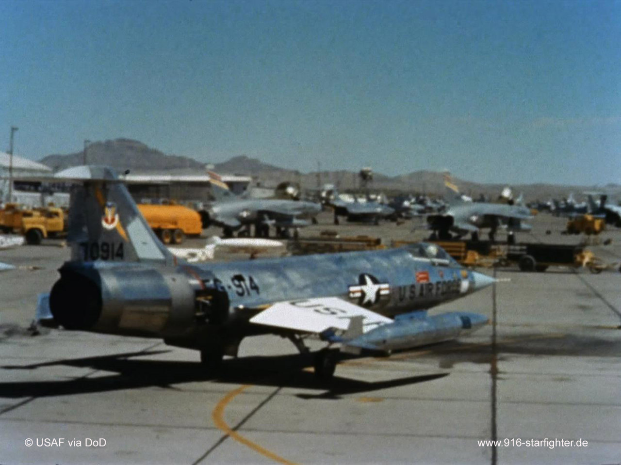 F-104C "FG-914" (57-0914) 479 TFW at Nellis AFB during "William Tell" Gunnery Meet 1962 F-104C, construction number 183-1231, model 483-04-05, US serial number 57-0914, built by Lockheeddelivered to the USAF April 26, 1959; 479th Tactical Fighter Wing (Tactical Air Command), George AFB, CA (deployments to Moron AB Spain, Ramey AFB PR, McChord AFB, WA) April 1959-July 1966 436th TFS static at RAF Waddington "Battle of Britain" Open House September 17, 1960 deployed from Moron AB, Spain 435th TFS 479th TFW, winner of William Tell Meet in September 1962 436th TFS July 12, 1965-October 14, 1965 DaNang, 435th Tactical Fighter Squadron (Pacific Air Forces), Udorn RTAFB, Thailand from July 1966 till January 1967 crashed January 16, 1967 after suffering an engine failure during a CAP mission and crashed at Udorn into the Golf (operational loss), pilot ejected safely. Claim of Fame: Overall winning F-104C pilot was USAF Captain Charles "Chuck" E. Tofferi, flying 57-0914. The William Tell 1962 video can be seen here: