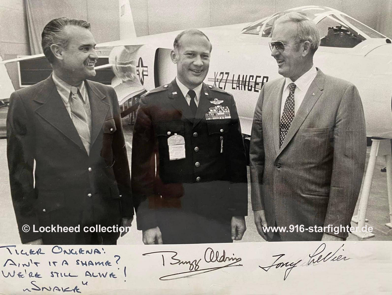 Colonel Edwin E. "Buzz" Aldrin with Test Pilot Glen "Snake" Reaves and Chief Test Pilot Tony LeVier in 1971 Edwin Eugene Aldrin graduated from the United States Military Academy in 1951 with a bachelor of science degree, became a rated pilot in the USAF by 1952, and received his doctorate of science from Massachusetts Institute of Technology in 1963. "Buzz" Aldrin flew 66 combat missions in the Korean War and is credited with two confirmed victories. After serving as a test pilot and gunnery instructor, he was assigned to the Air Force Academy as assistant to the dean. He entered the space program in the Air Force Space Systems Division where he was selected for astronaut training. Aldrin's first space flight was on the November 11th 1966 Gemini XII mission where he performed a rendezvous with a previously launched satellite and spent a record five and a half hours outside the spacecraft in extravehicular activity. As part of the historic July 16-24, 1969 Apollo XI first moon landing mission, he became the second man to walk on the moon when he followed Neil Armstrong to the surface on July 20th, spending two hours and 15 minutes collecting surface samples and deploying experiments. He piloted the Eagle back into space to rendezvous with the parent Apollo spacecraft Columbia for return to earth. In July 1971 returned to the Air Force as commander of the test pilot school at Edwards Air Force Base (July 1971-February 1972) Colonel Aldrin has logged over 289 hours in space flight. Colonel Aldrin retired from NASA and the Air Force in 1972. copyright © Lockheed collection