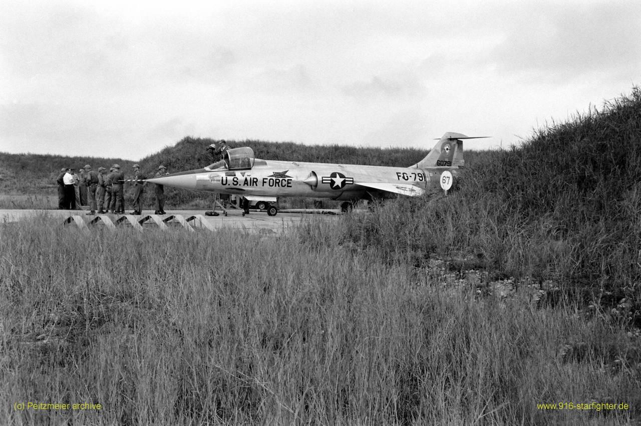 F-104A "FG-791" 56-0791 of the 83rd Fighter Interceptor Squadron for Operation "Jonah Able" at Tao Yuan AB, Taiwan during the Quemoy Crisis The Starfighter were all from the 83rd Fighter Interceptor Squadron (FIS) at Hamilton AFB in California. They were airlifted by C-124 "Globemaster" transport aircraft to Tao Yuan AB, Taiwan from Hamilton AFB in September 1958. The first cargo aircraft of the movement departed Hamilton AFB on September 8, 1958, less than 48 hours after the official notification. The first F-104A arrived in Taiwan on September 11, 1958. Within thirty hours, at 16.00 hours on September 12, 1958, the first F-104 flown by the Squadron Commander, was airborne to defend the Republic of China. Commander of the 83rd FIS was LtCol John W. Bennett and the Operations Officer was Major Carl H. Leo. In December 1958, while these 12 F-104As were still at Tao Yuan AB near Taipei in Taiwan, the control of these 12 F-104A was transferred to the 337th FIS from Westover AFB, Massachusetts, commanded by LtCol James Jabarra. The shelling of Quemoy was reduced on September 13, 1958 and was suspended on October 6, 1958. The Nike Hercules surface-to-air missile systems were turned over to Taiwan Armed Forces in 1959 but the 12 F-104As were all transferred back to McClellan AFB in Sacramento, California for depot maintenance work in March 1959. They were later transferred to other units within the Air Defense Command. copyright © Peitzmeier archive