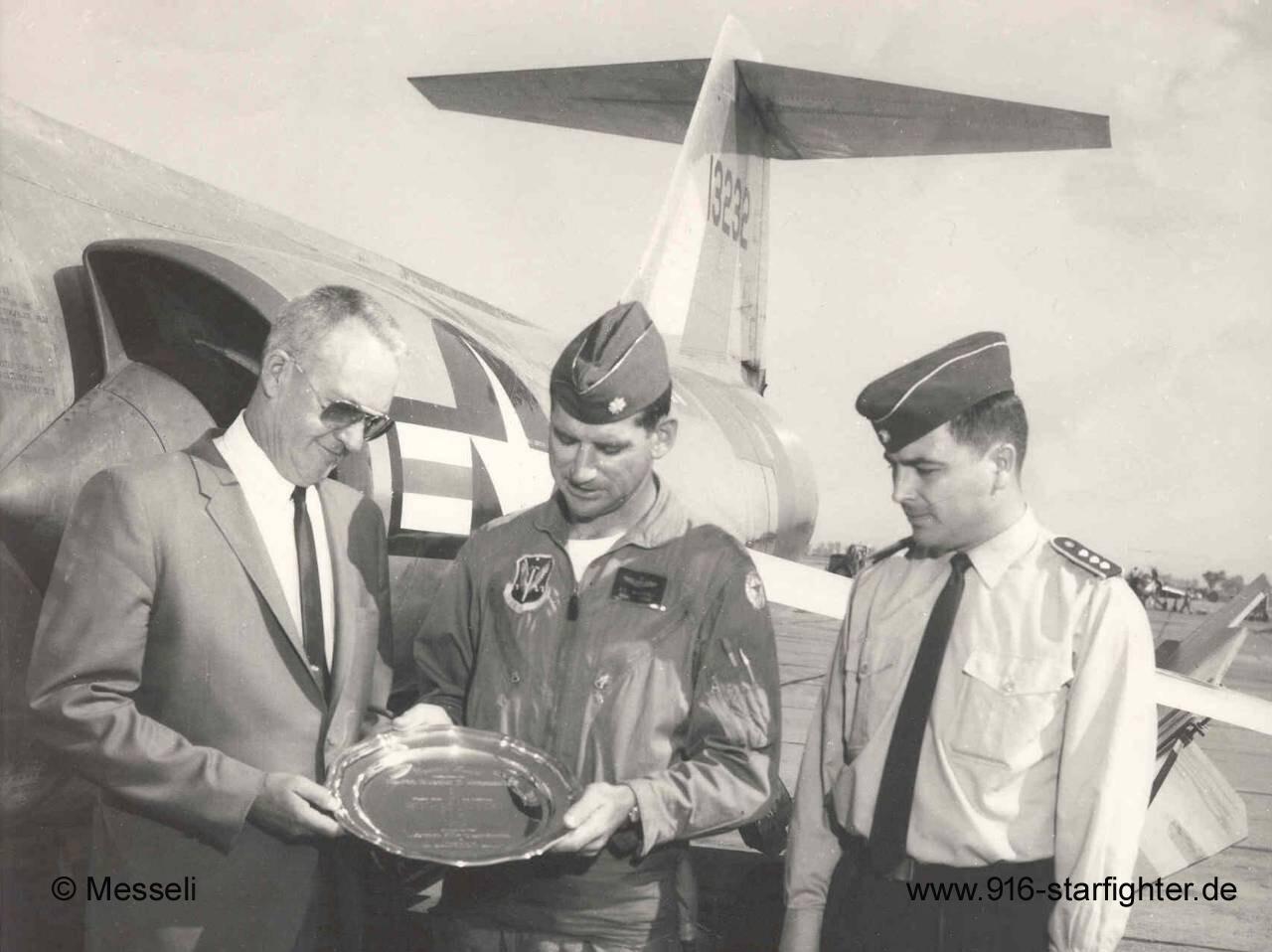 Lockheed test pilot Tony LeVier presenting Maj Robert E. Messerli a silver tray for being the first pilot to fly 2000 hours in the F-104 in 1964 Major General Robert E. Messerli (Ret.) started flying the F-104A in 1958 at Wright-Patterson AFB, Ohio. In 1959 he went to George AFB, California flying F-104C and in 1961 he was in the first USAF Squadron (435TFS) to train experienced German AF pilots in the F-104G. In 1964 he was assigned to Luke AFB, AZ where as Chief of Training Analysis and Development, designed and wrote the syllabi for all training phases of the newly formed German Air Force F-104G training program. First man to fly 2000 hours in the F-104 aircraft. That was in the fall of 1964. In 1967 he departed Luke AFB to fly the F-4 aircraft and was assigned to Vietnam where he flew 205 combat mission, 103 of them over North Vietnam. He was involved with the German Air Force F-104 training program from its very beginning. copyright © Bob Messerli