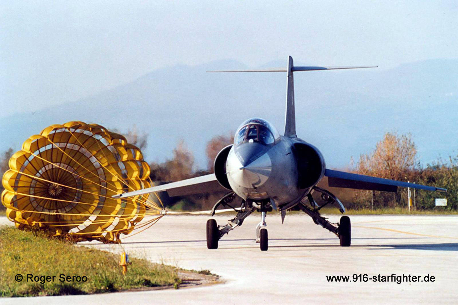 F-104S ASA MM6934 "9-31" of 9°Stormo at Grazzanise dragging the chute off the runway copyright © Roger Seroo