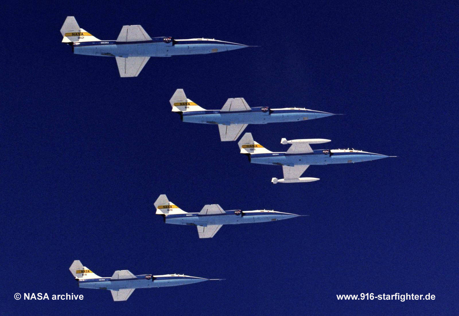 NASA "Blue 5" formation April 11, 1975 The only time the five ship fleet of NASA Dryden's F-104 Starfighter was ever airborne at the same time. Pilots were: F-104N #811-Bill Dana; F-104N #812-Tom McMurtry; F-104A #818-Einar Enevoldson; F-104A #820-Gary Krier; F-104B #819-Fitz Fulton and Ray Young. Photo taken from T-38 #821 flown by Fitz Fulton; April 11, 1975 copyright © NASA archive