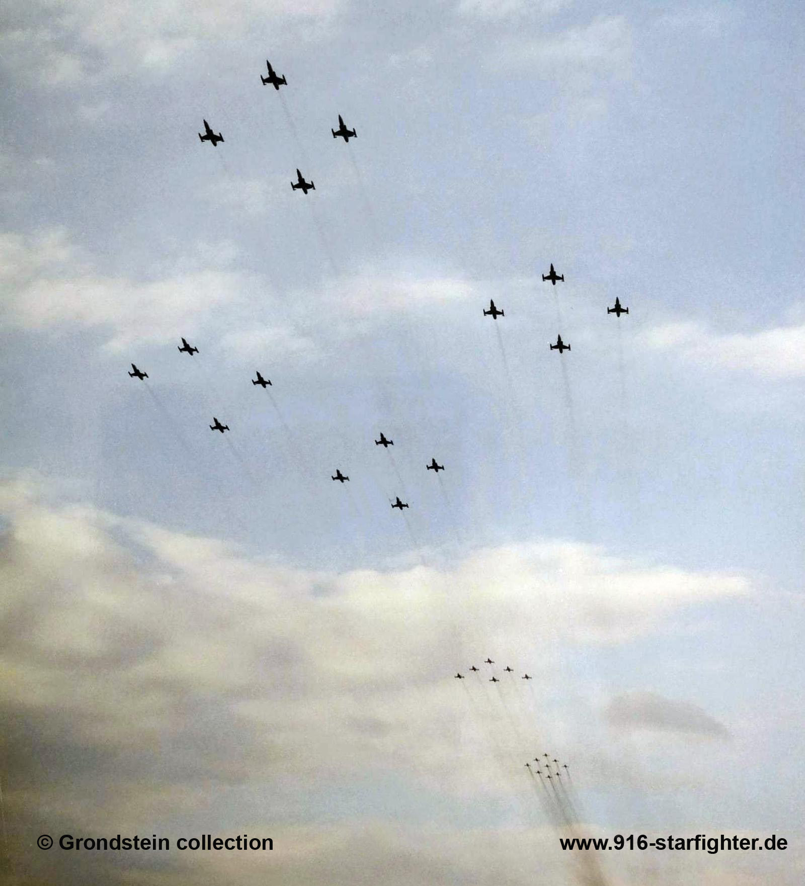 F-104 Mass Fly-by at Decimomannu AB, Sardinia February 27, 1986 16 ship Luftwaffe, 6 ship Marine, 9 ship Italian Air Force copyright © "Blacky" Schwarz