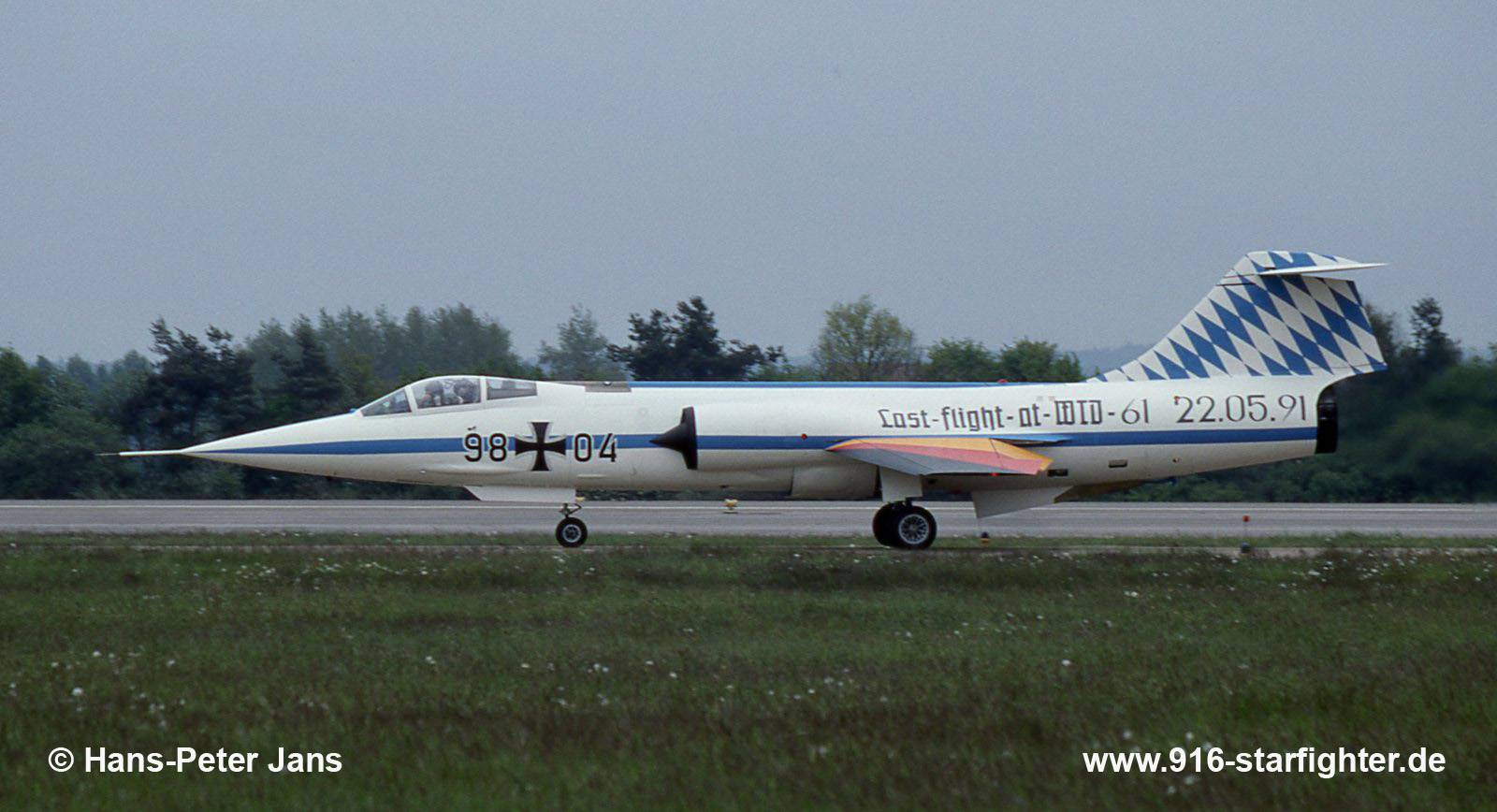 F-104G 98+04 taxiing for the last flight F-104G, construction number 683D-7406, model 683-10-19, built by MBB (Messerschmitt-Bölkow-Blohm) manufactured by South Group (ARGE-Süd) & VFW; assembly start August 31, 1971 as attrition replacement aircraft first flight October 22, 1971 at MBB; acceptance date December 16, 1971 by GPS-MBB modification level "Neptun" as Fighterbomber (for German Navy) with AS.30 and "Kormoran" anti ship missile delivery system; Navy camouflage scheme "Norm 76" according tech order "TA-196-3" 26+60 MFG 1 at Schleswig-Jagel AB delivery date on December 22, 1971; MFG 2 at Eggebek AB on September 1, 1981 until 1987 Luftwaffenschleuse 11 for AN/ALE-40(N) Chaff/Flare countermeasure dispenser equipment according tech order "TA-1469" on March 11, 1982, back to MFG 2 on May 12, 1982; WTD 61 at Manching AB on March 20, 1987; coded 98+04 on February 4, 1991 last F-104 flight in Germany May 22, 1991 with pilot OTL A. Ewert instructional airframe at WTD 61 with 2.768 flight hours; struck off charge order (AVA) January 15, 1992 1997 first noted with training aid code "11"; March 2014 noted; June 2023 noted. copyright © Hans-Peter Jans