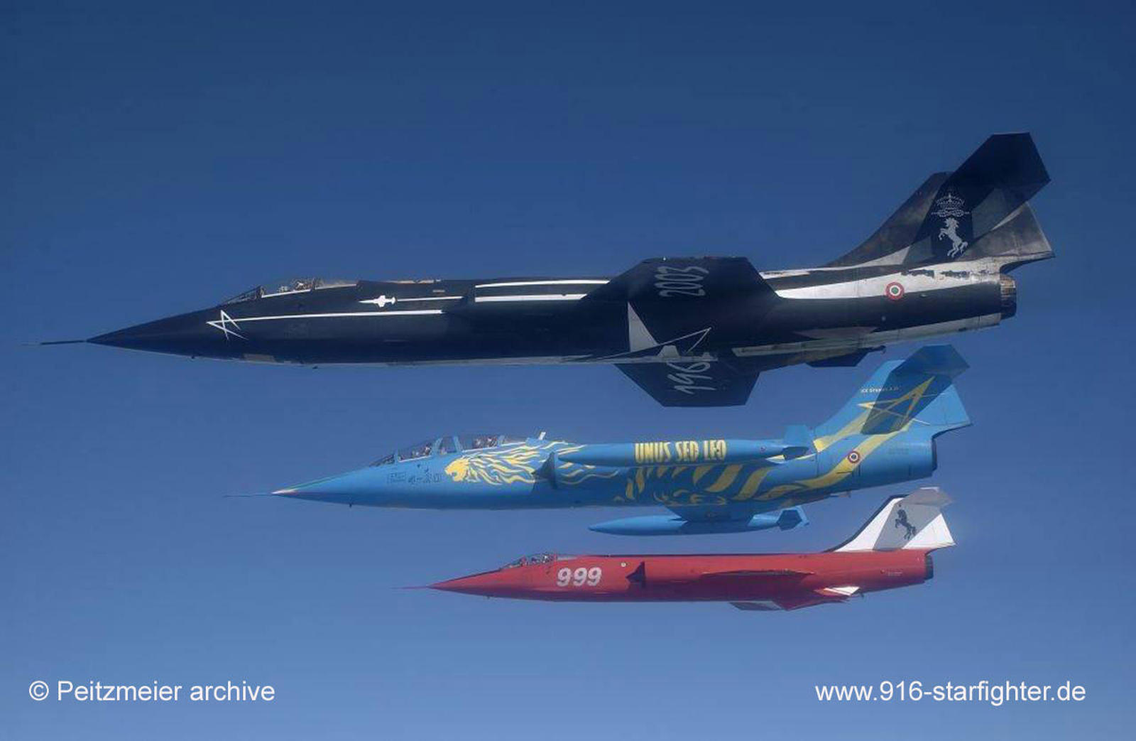F-104S ASA-M "9.99" line abreast with TF-104G-M "4-20" and F-104S ASA-M "4-9" MM6873 from IX Gruppo of 4°Stormo copyright © Peitzmeier archive