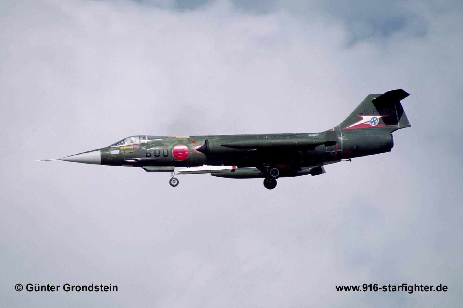 F-104J "600" (46-8600) 207th Hikotai (squadron) of 7th Wing JASDF carrying a "dark green overall" ACM colorscheme at Naha AB in August 1985 F-104J, construction number 683B-3100, model 583-07-14, serial number 46-8600, built by MitsubishiJapanese Air Self Defense Forces (JASDF) Order of Operations delivery date June 15, 1964; first unit 5th Kokudan at Nyutabaru AB; after 7th Kokudan was established assigned to Hyakuri from about 1969, stored until 1977 203rd Hikotai at Chitose 1977 until 1982; EF-104J (modified as ECM version to carry Electronic Countermeasures Pod ALQ-4); 203rd squadron at Komatsu AB 1982 with ALQ-4 ECM pods 1982 207th Hikotai until 1984; dark green paint for ACM competition 207th Squadron at Naha AB 1985; retired from active duty and stored in the No.2 Supply Depot at Gifu Air Base June 26, 1990 converted as QF-104J 46-3600 (manned flight capable) at Mitsubishi Heavy Industries Aerospace Systems, Komaki South Plant, Aichi Prefecture UF-104J (piloted drone prototype) tested by ADTW 1993; in March 1994 flown to Iwo Jima; UF-104J target drone re-serialed as 46-3600 shot down 11.03.1997 by a training missile at firing range located near Iwo Jima island. copyright © Grondstein