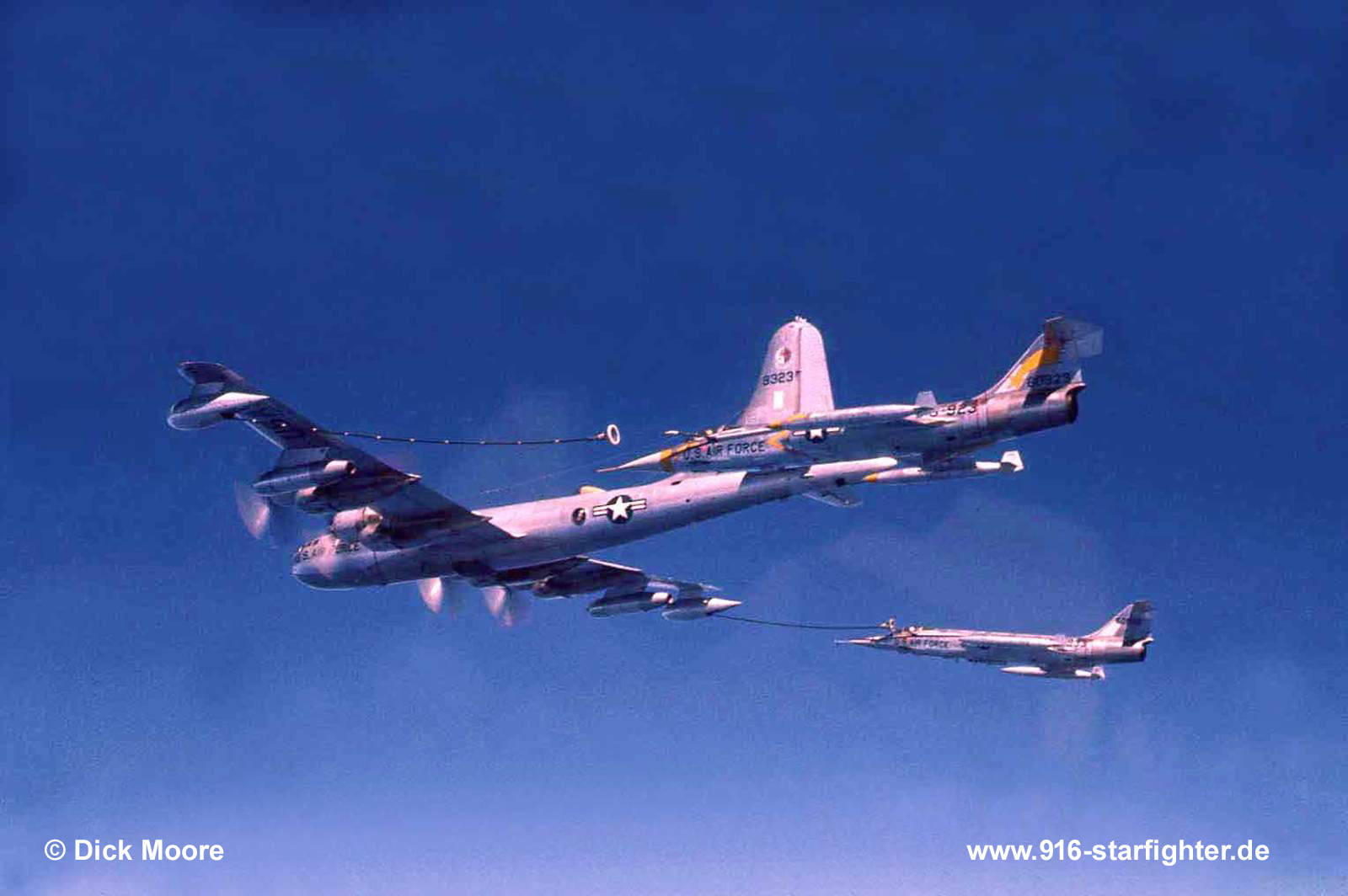George AFB 436 TFS: F-104C 56-0923 taking fuel from KB-50J "Superfortress" Picture taken by Richard "Dick" Moore during his time with the 436th Tactical Fighter Squadron