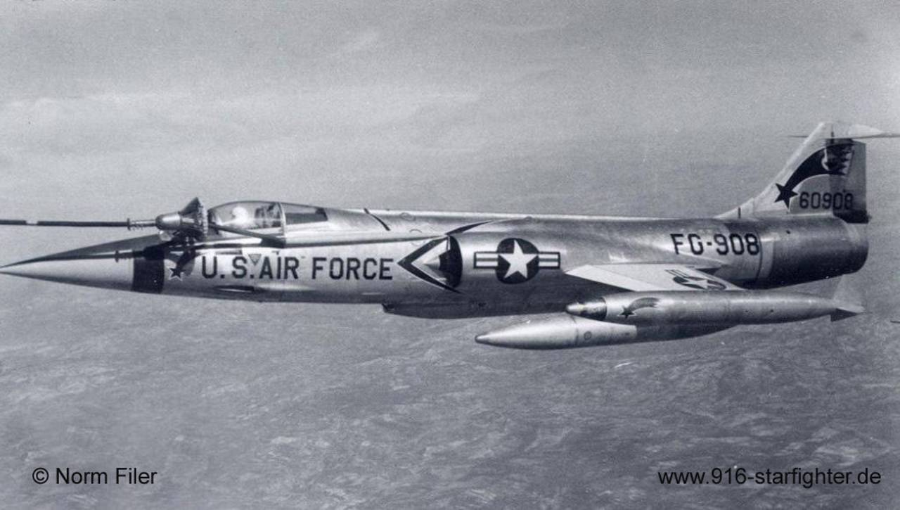 F-104C "FG-908" 476th TFS "Blue Knights" refuelling high over Spain 1959, one stripe behind the cockpit marking a flight commander aircraft F-104C, construction number 183-1196, model 483-04-05, US serial number 56-0908, built by Lockheed delivery date December 18, 1958; 479th TFW, 476th TFS Moron AB, Spain 1960 hit by ground fire on a bomb run with 2 "M-117" 750 lbs bombs on July 22, 1965 with 436th TFS, attached to 6252nd TFW crashed after a gear up emergency landing at Chu Lai MCAS, Vietnam battle-damaged aircraft swerved off the runway into a sand dune after gear up landing pilot Capt (Major select) Roy James Blakeley was killed (KIA) the unit operated out of DaNang AB, Vietnam, attached to the 6252nd TFW, written off. copyright © Norm Filer