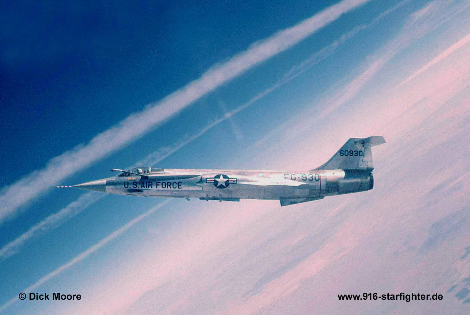 F-104C "FG-930" 476th TFS of 479th Tactical Fighter Wing 1960 F-104C, construction number 183-1218, model 483-04-05, serial number 56-0930, built by Lockheed delivery date March 18, 1959; 479th Tactical Fighter Wing; 476th TFS "Blue Knights" 1959-1960; 476th TFS deployed Moron, Spain November 12, 1959-March 18, 1960 crashed March 15, 1960 following engine failure in flight 4.5 miles east of Moron AB, Spain (deployment to Moron AB, Spain), pilot ejected safely, written off. 436th TFS "Black Aces" (Yellow/Black) March 1959-July 1967 F-104C/D, a Fighter Bomber unit deployed to Moron AB, Spain 1960 deployed to Hahn AB January 18, 1962-April 12, 1962 deployed to DaNang AB, Vietnam July 12, 1965 - October 14, 1965 deployed to Udorn RTAFB, Thailand from May 1966 until July 1967 converted to F-4D and transferred to the 4531st TFW copyright © Dick Moore