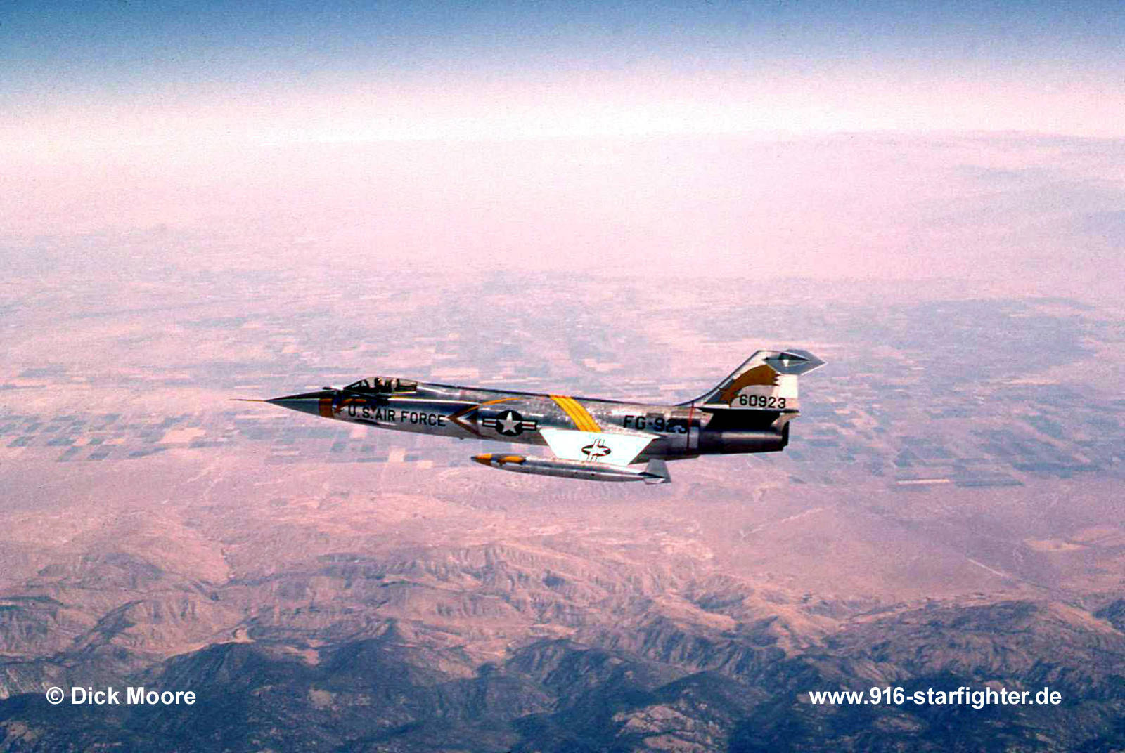 F-104C "FG-923" 436th TFS "Black Aces" Commanders aircraft, three stripes over the fuselage marking the WCO's aircraft in 1959 F-104C, construction number 183-1211, model 483-04-05, serial number 56-0923, built by Lockheed delivery date February 6, 1959; 479th TFW 436 TFS 1960 crashed June 26, 1961 after midair collision with 57-0917 near Charlottesville, Virginia, written off, pilot ejected safely and was not injured. This accident occurred in a five-ship formation flight (navigation and training mission) from George AFB, California to Andrews AFB, Maryland with a refuelling stop at Richards-Gebaur AFB, Missouri. The flight departed on an instrument flight plan maintaining visual flight conditions. There was no severe weather forecast. The flight leveled off in a cruise climb at 38,000' in route formation. A short time after passing Charleston's VOR a collision occurred between No. 3 (Capt Derrick) and No. 4 (Capt Klix). After the collision No. 4 (Capt Klix) entered a descent to the right and was last seen entering overcast. A short time after Capt Klix stated that he was bailing out. No.3 (Capt Derrick) was not seen again after disappearing out of the flight inverted and disintegrating, following the collision. Capt Klix ejected safely and was not injured. Capt Derrick did not eject and was fatally injured. Duration of flight was 1 hour 30 min. The crash sites are located approximately 28 NM southwest of Charlottesville, Virginia in the Blue Ridge Mountains area. The first F-104Cs began to reach the TAC in September of 1958. It served with four squadrons (434th, 435th, 436th, and 476th) of the 479th Tactical Fighter Wing, based at George AFB. It was primarily intended for nuclear strike, but it could also carry out ground attack missions with conventional weapons. copyright © Dick Moore