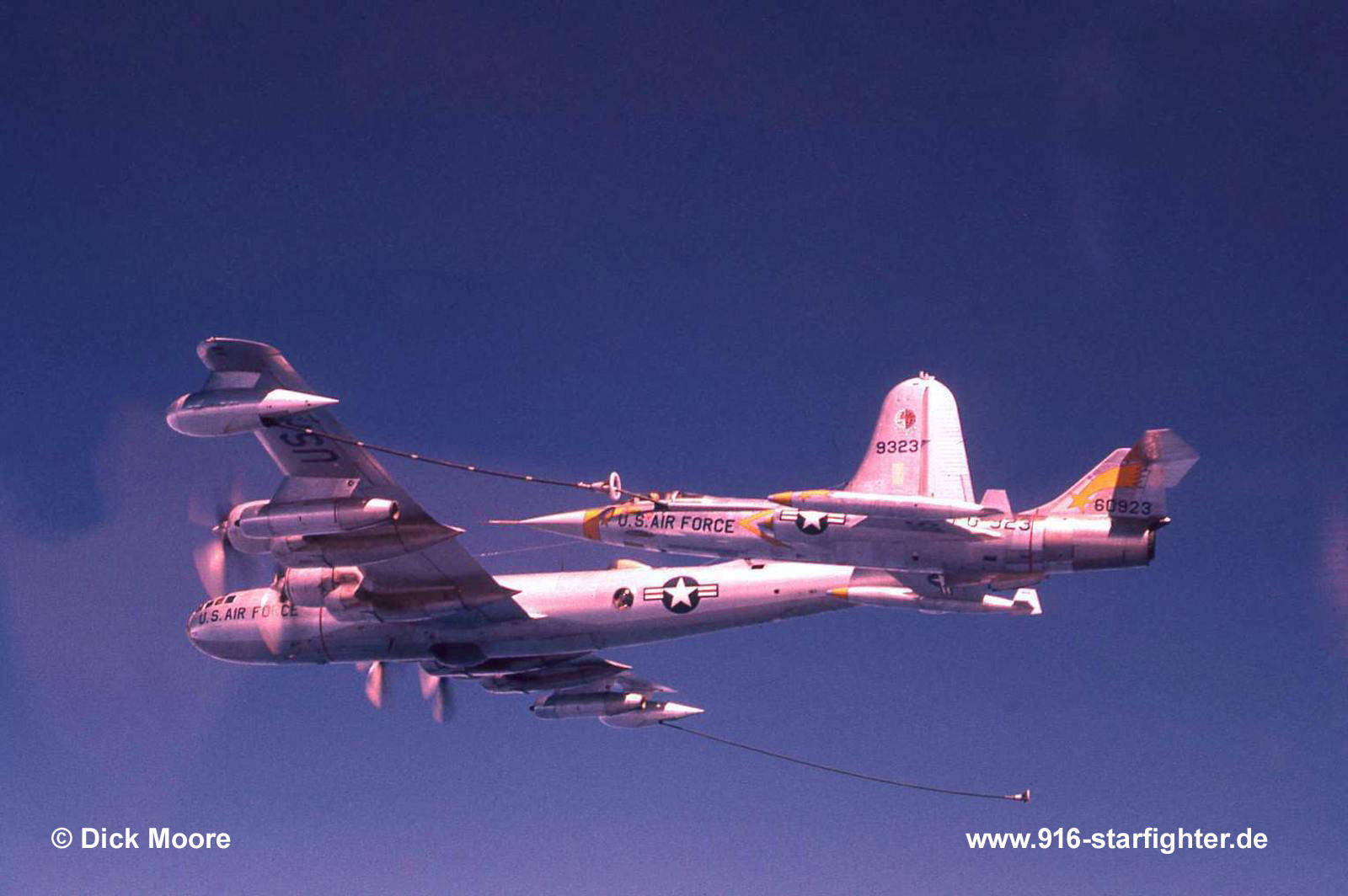 F-104C "60923" 436th TFS "Black Aces" refuels from a KB-50J tanker 1959 F-104C, construction number 183-1211, model 483-04-05, serial number 56-0923, built by Lockheed delivery date February 6, 1959; 479th TFW 436 TFS 1960 crashed June 26, 1961 after midair collision with 57-0917 near Charlottesville, Virginia, written off; pilot ejected safely and was not injured. The Boeing KB-50 tanker was a modified Boeing B-50 Superfortress for air refueling needs by the USAF. The first KB-50 flew in December 1955 and was accepted by the Air Force in January 1956. KB-50J (J for Jet) was a B-50 tanker with improved performance, via two extra General Electric J47 turbojets under the outer wings copyright © Dick Moore